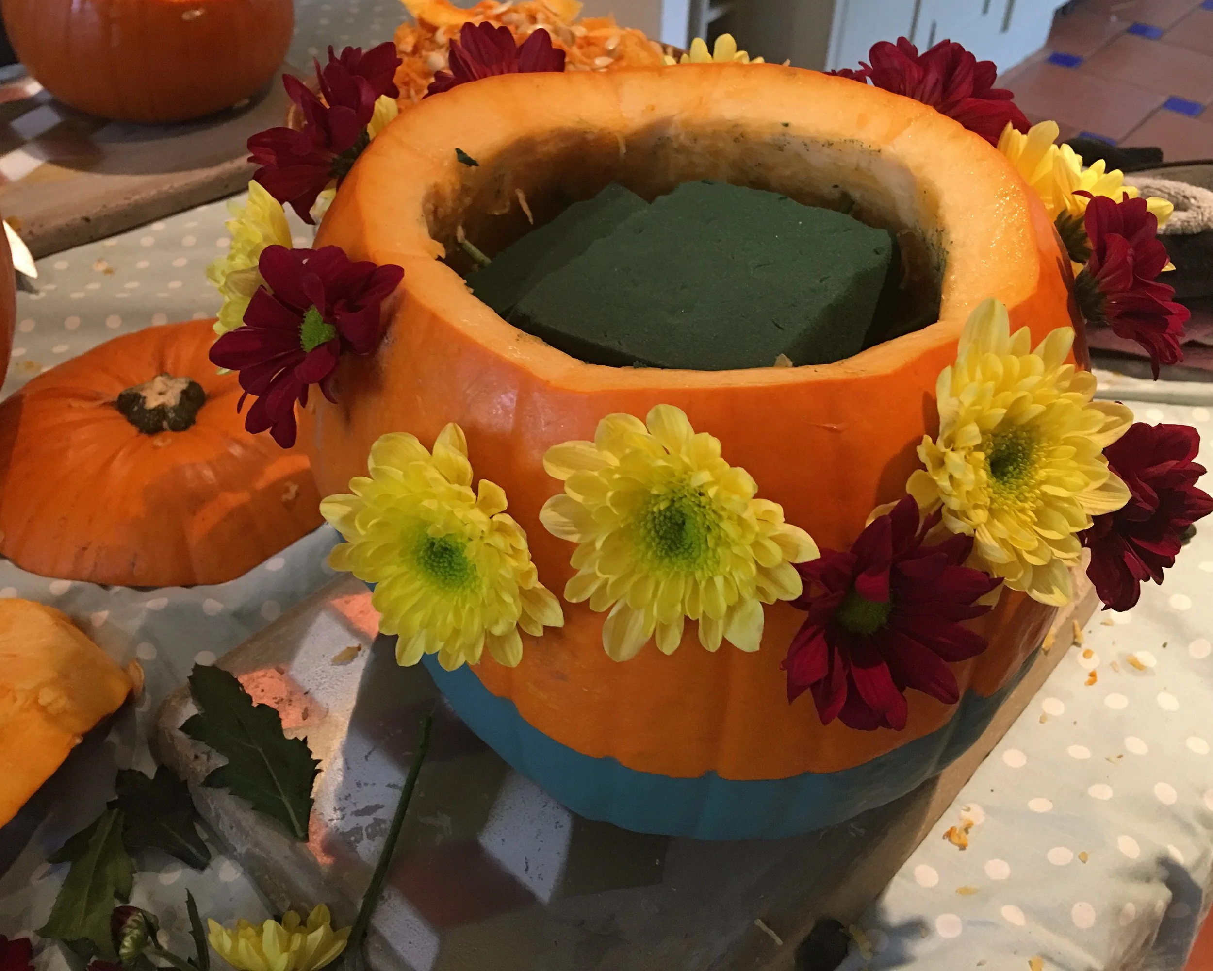 Inside the pumpkin I placed a block of soaked oasis, which will keep the flowers alive over the Halloween weekend, then threaded through individual stems of cheap supermarket-brought chrysanthemums: