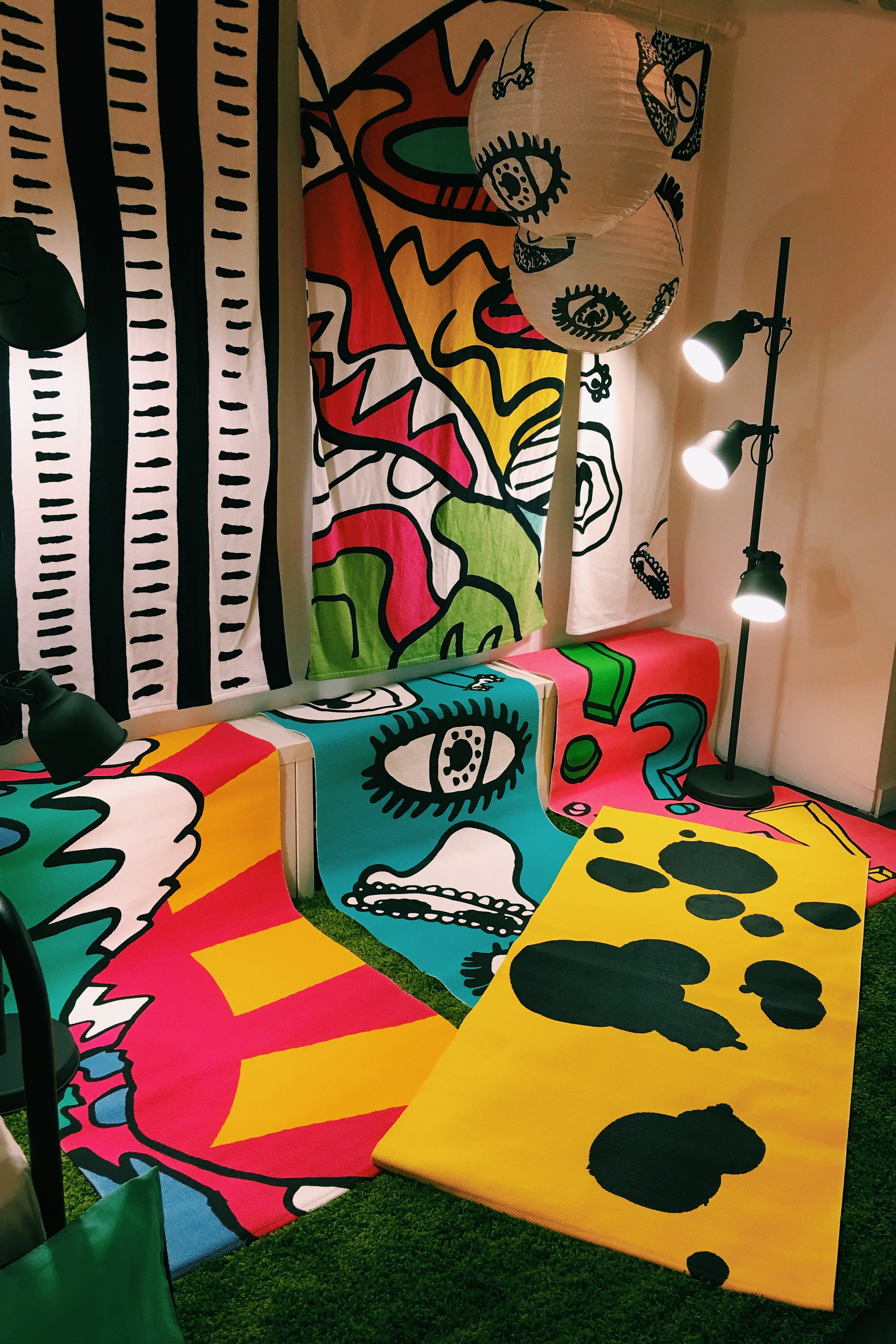 Colourful, bold, and blatantly aimed at the yoof, the 28 year old East London-based fashion designer has worked with Ikea on a limited edition collection titled SPRIDD. The result is a riot of cartoon-like prints of mushrooms, facial features, volcanoes and punctuation marks, with a real early 90's influence. These prints are spread across a range of homeware items such as mugs, plates, cushions and bedlinen, as well as t-shirts, duffel bags and even tents (a first for Ikea).