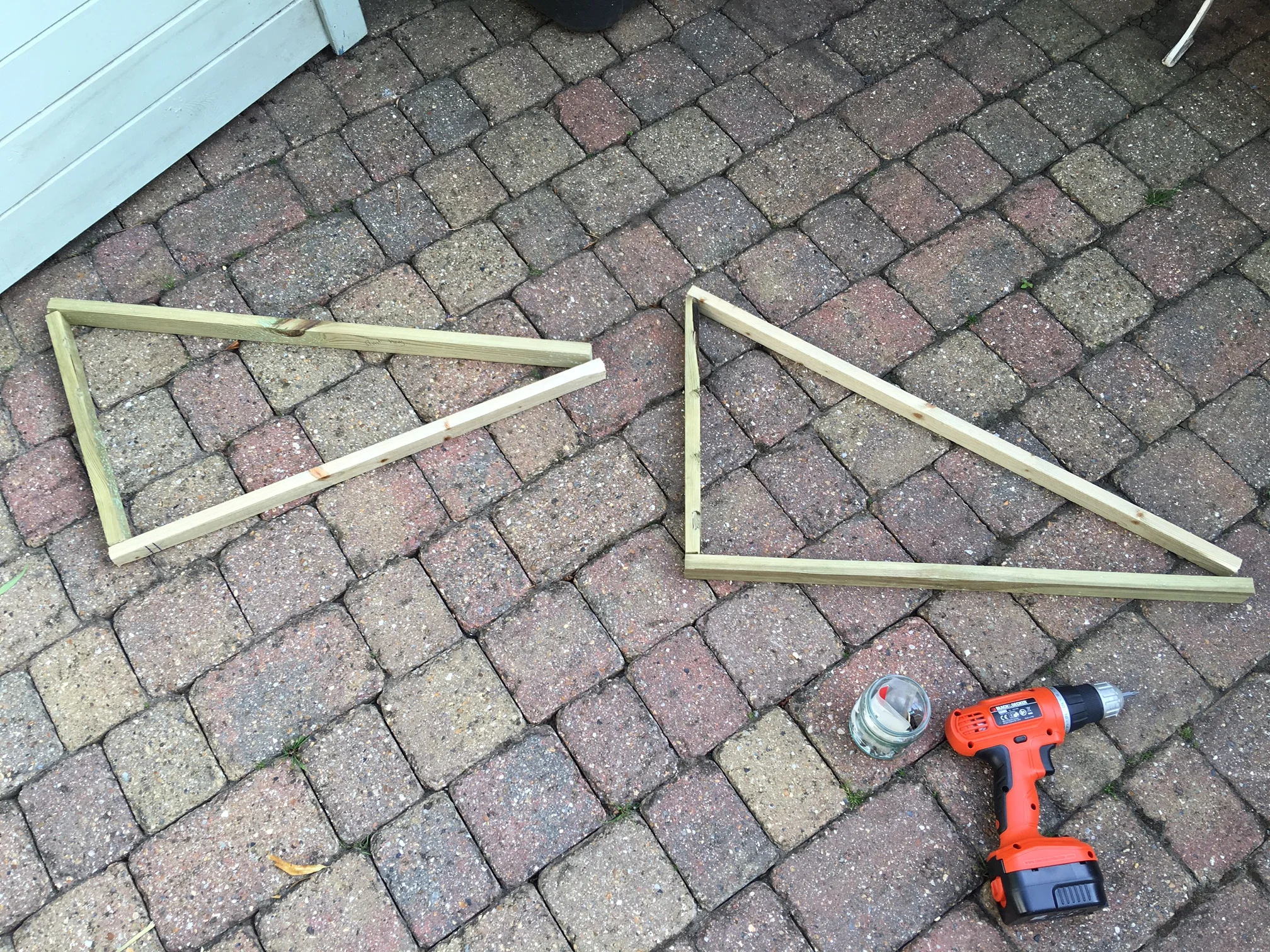 To make these two supports, measure how high you want your awning and how far you want it to come out. Screw all these pieces together with some long screws. It doesn't need to look perfect as it will be covered when it is up: