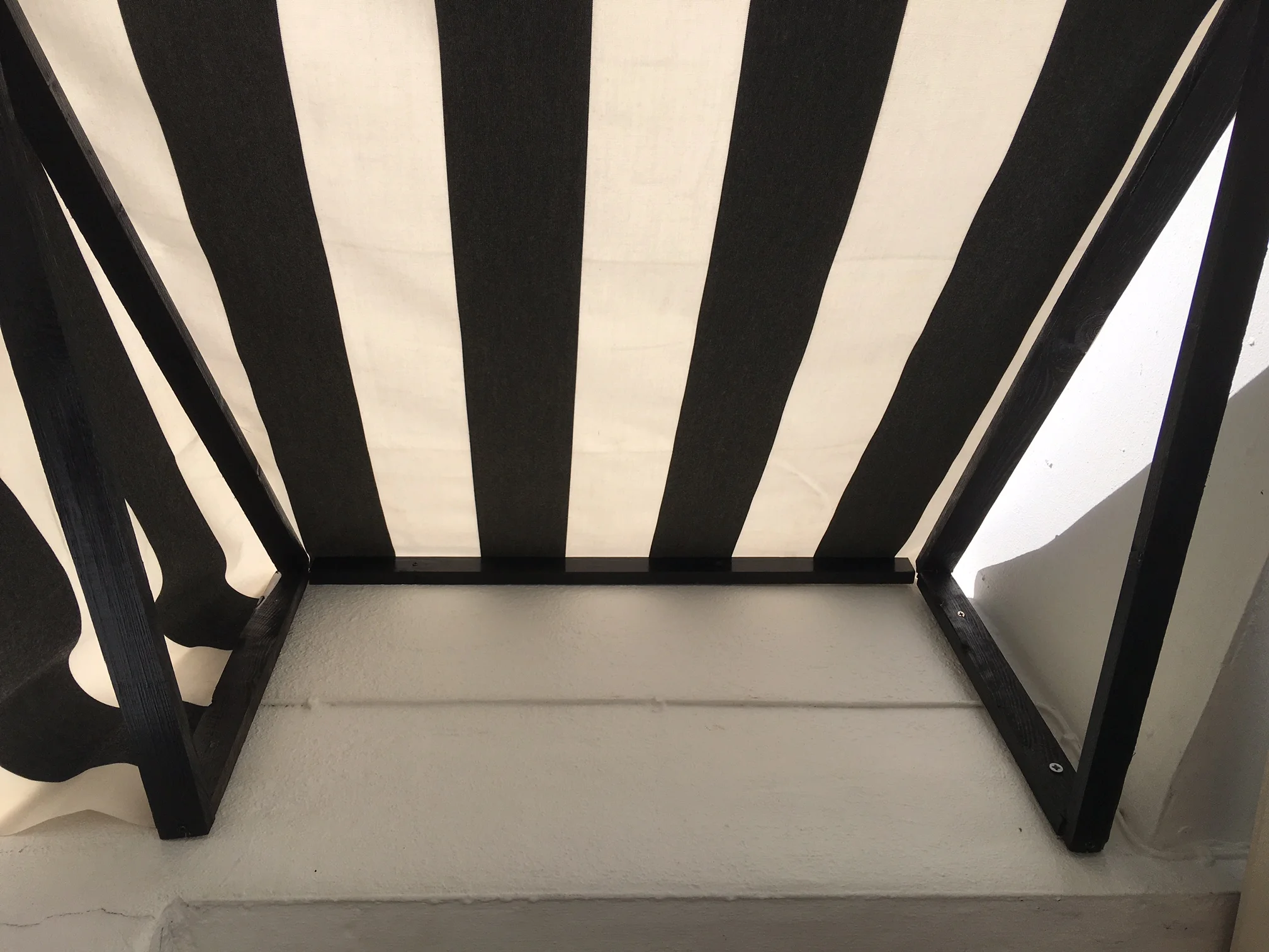 Place your awning fabric on the wall and screw the wood in place. Drape the fabric into the correct position and then use a staple gun to secure it to the wooden support. Try and conceal the staples as much as possible - on my fabric I stapled only on the black stripes, then coloured in the staples with black permanent marker after so they were not visible. It worked pretty well!