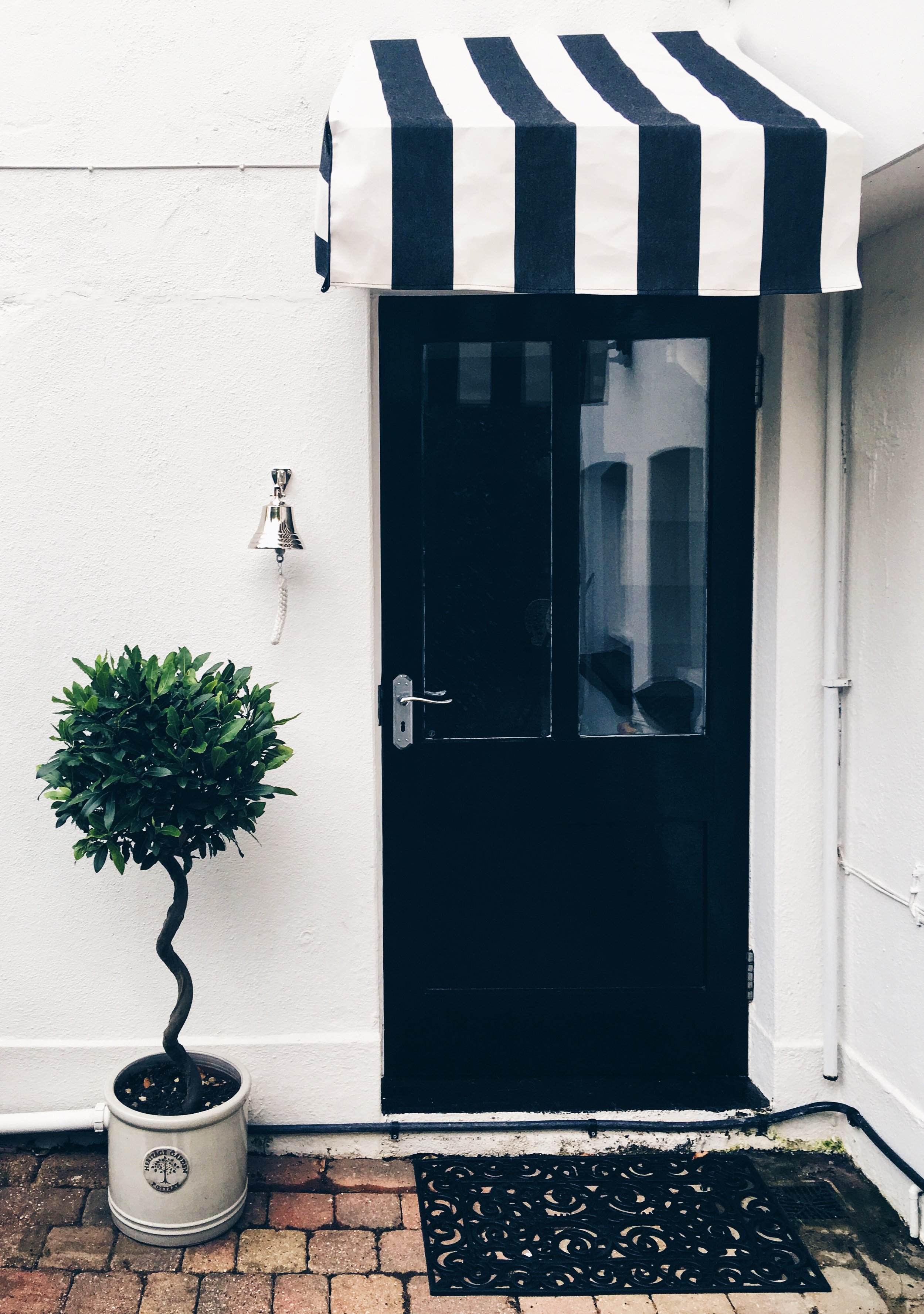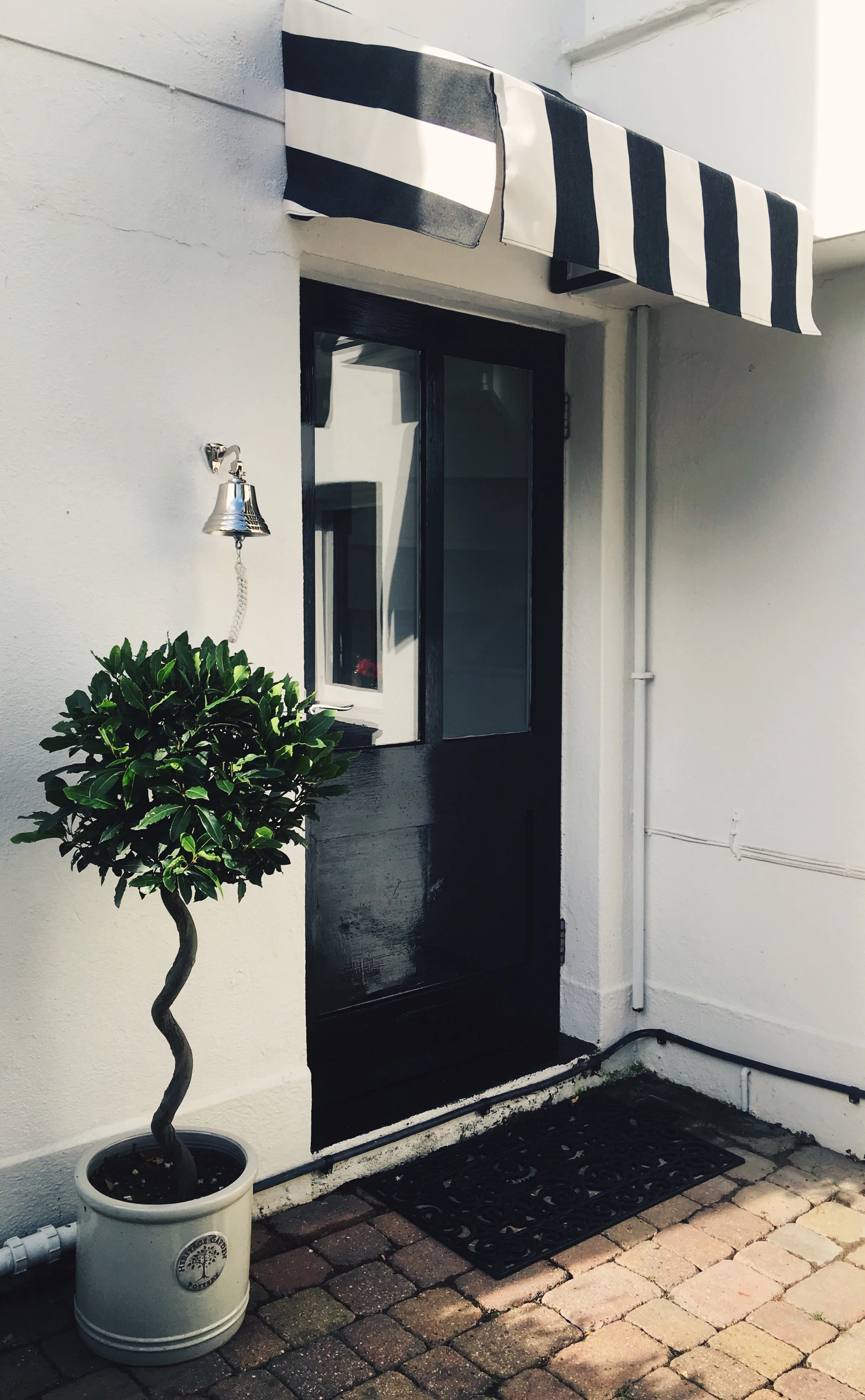 As I went for black and white striped awning, I gave the door two coats of black gloss, and added this pretty wrought-effect outside rubber door mat to match