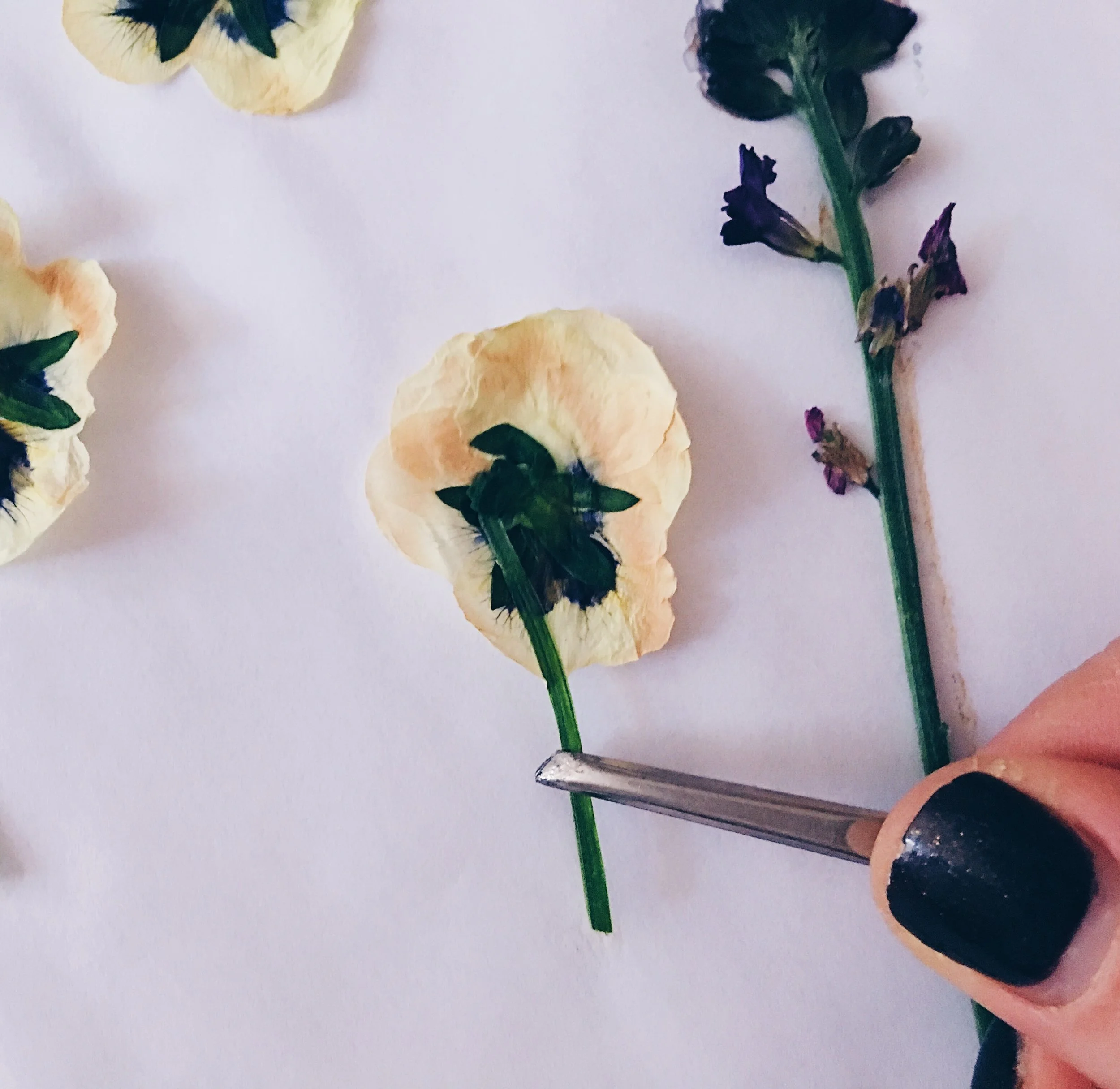 Using tweezers and a steady hand, gently lift the pressed flowers away from the paper and place them on a smooth surface.