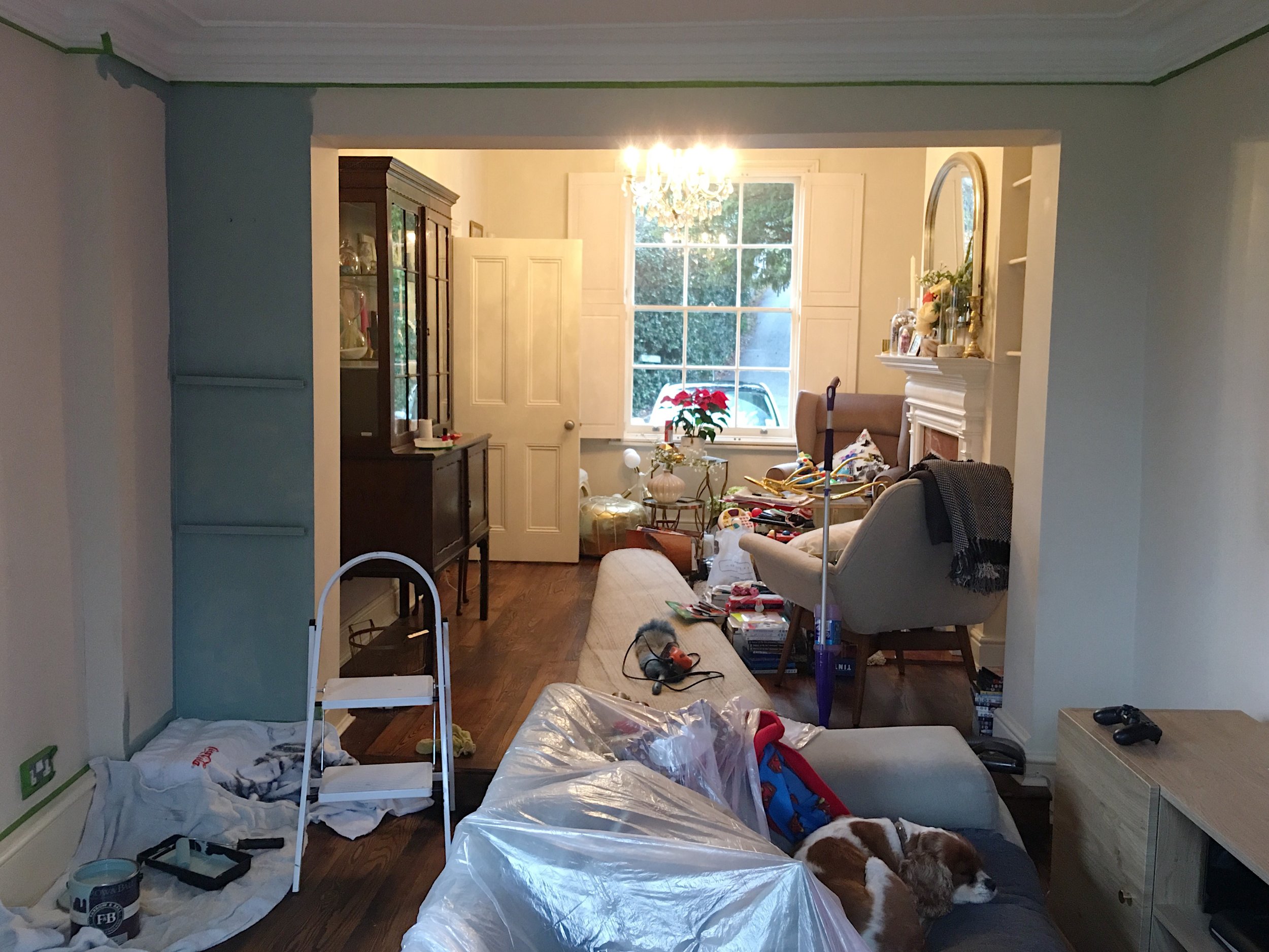 One thing that I did want to achieve with the room was to separate it from the other end. My living room is kind of divided, and I wanted the front part with the fire to be more of a 'reading' area, and the part I painted with the TV in to be more of a 'snug'. I was hoping by painting the TV area a different colour the rooms would appear two separate areas. The concern was that instead of working coherently, it would just look weird. Luckily, I think it does work. You can see in the photo below that the side being painted in Dix Blue instantly distances itself from the further part of the room and creates its own seperate area: