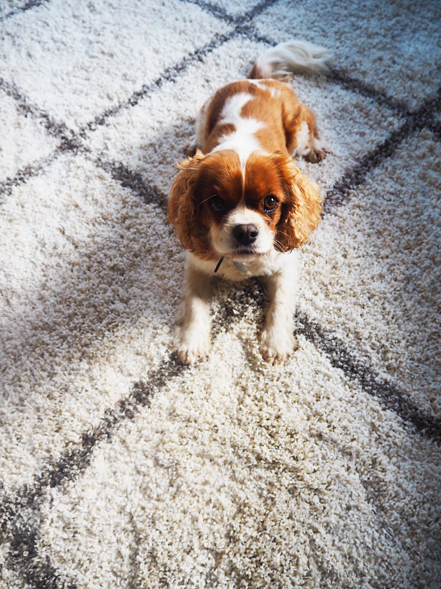 One thing I changed from the original mood board was the choice of rug. I felt that the artwork, cushions and pink decorative items added enough to the room, and the rug should be more neutral. I chose this diamond pattern grey and ivory rug and I am so happy that I did. It has such a deep pile and feels so luxurious, everyone comments on it when they come in.