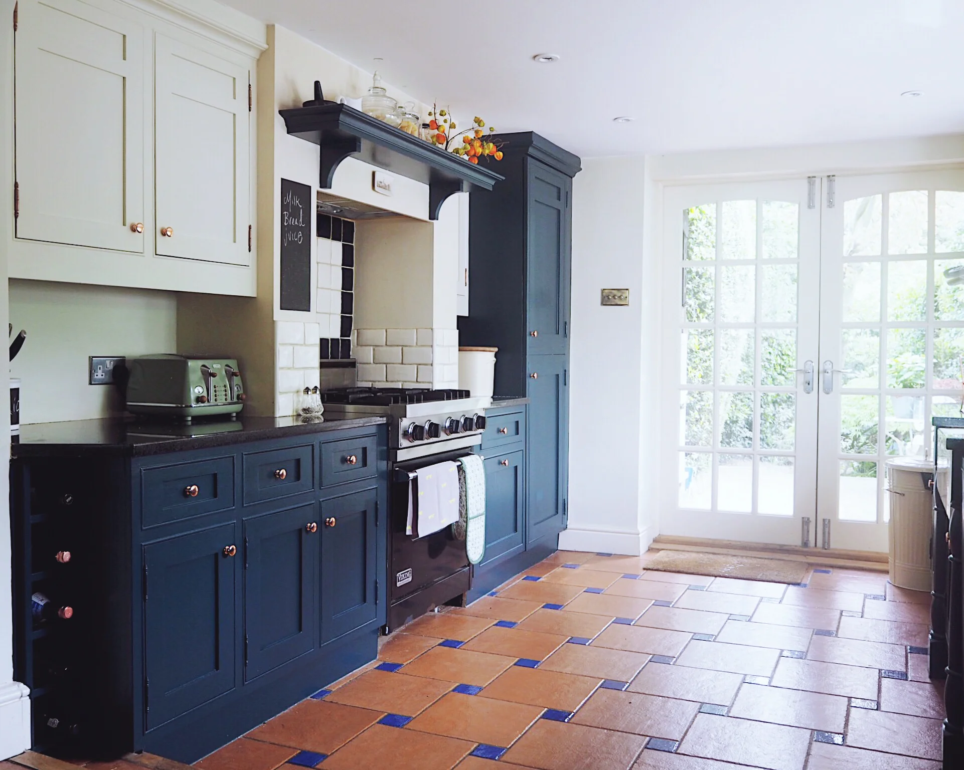 How my kitchen looks now, with base units painted in Hague blue, and top units painted in Clunch, both Farrow & Ball.