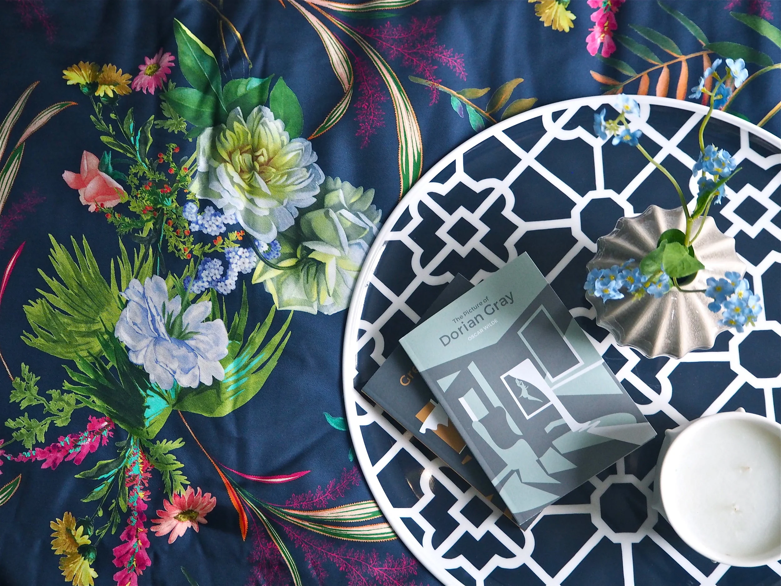 To layer up the bed, I've also added a bed throw and matching cushion from the Bouquets range by Yves Delorme. Both 100% printed silk with celadon piped finish, I fell in love with the vibrant floral design on a dark blue background - which is exactly what I liked about the wallpaper!