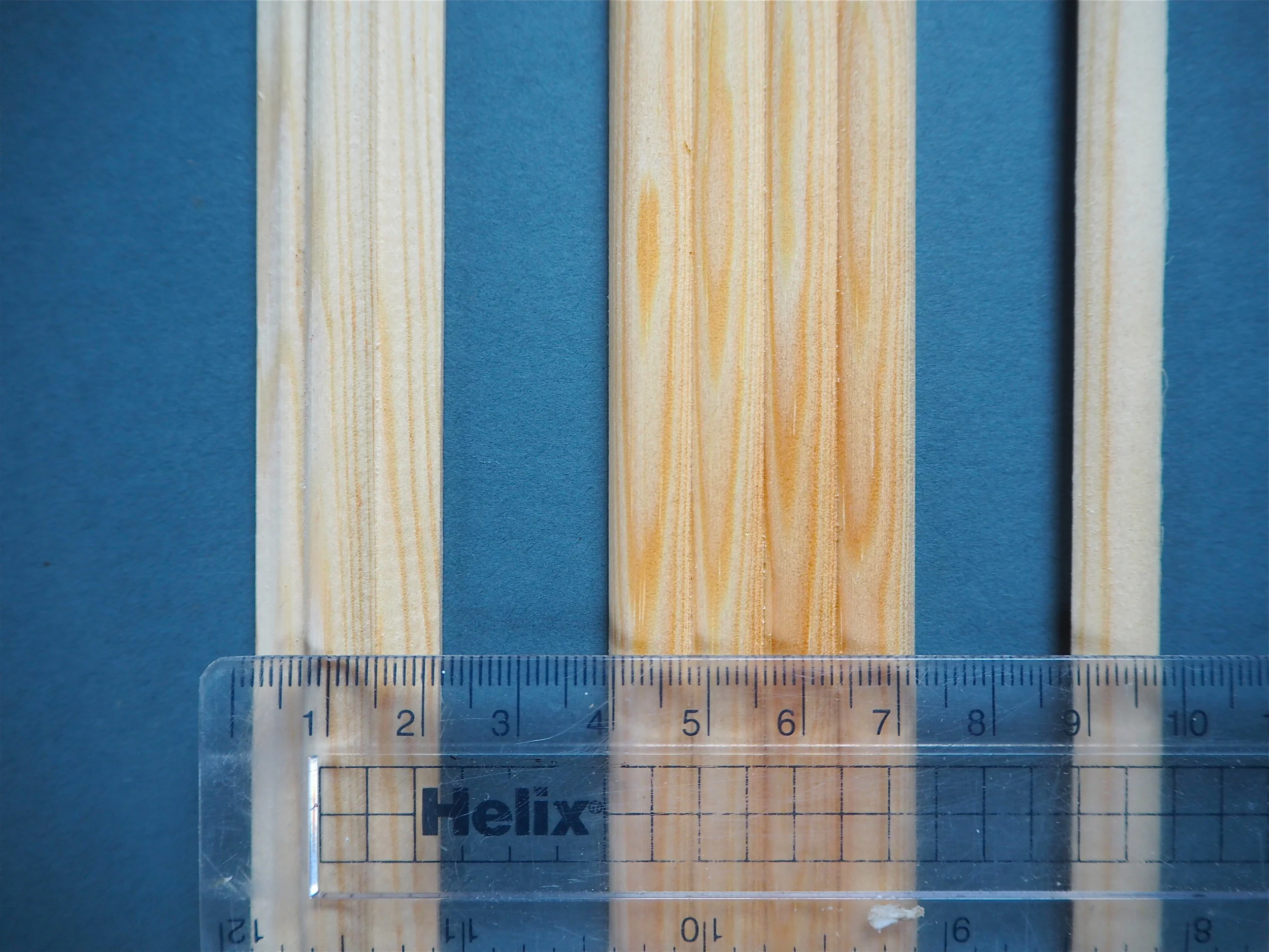 The main structure of the bookcases were now built, wallpapered, and had a central timber bar down the middle with the lights threaded through. I added in the rest of the shelving and then it was time to 'pimp up' the bookcase to look detailed and bespoke. I did this by using a number of decorative mouldings and beading, all of which I purchased from Wickes DIY stores for about £2-£7 each. I used trim number one in the picture below at 2cm width for the edges of the bookcase at the front. I used the second 3cm ridged moulding down the central timber bar in the middle and along the bottom of the bookcases. The third, 1cm width-wide moulding I used to disguise multiple shelf holes down the inside of the Billy.