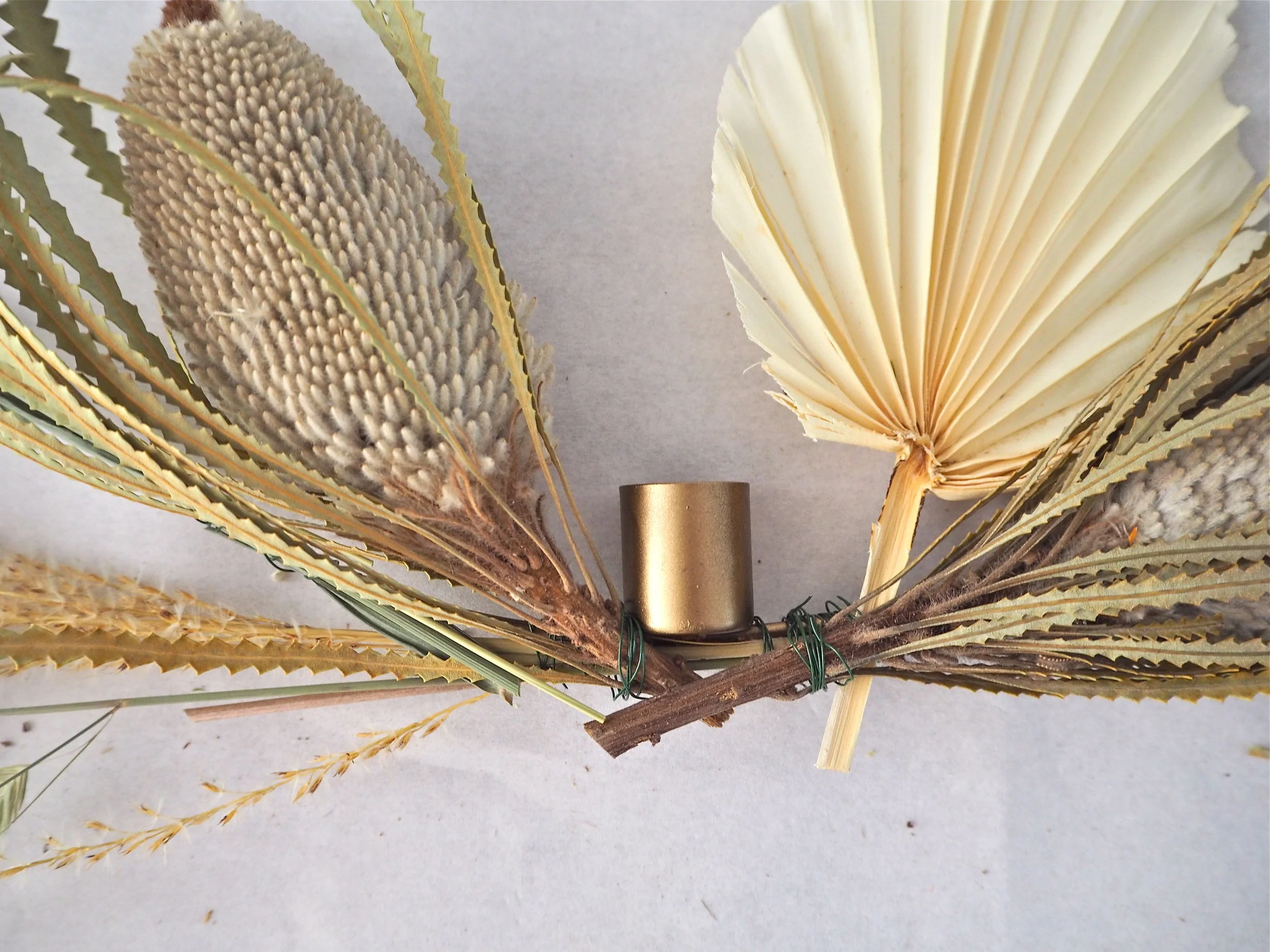 They key to getting the design right first time is to lay your hoop flat on a plain background, then lay your flowers down on top until you decide the best way to arrange them. For this wreath I used a lot of symmetry each side with each of the dried grasses and flowers to get a good balance. Using your florist wire, wrap the stems onto the base of the hoop by looping the wire tightly around both until the stem feels secure. Cut the wire and tuck the end in towards the hoop.