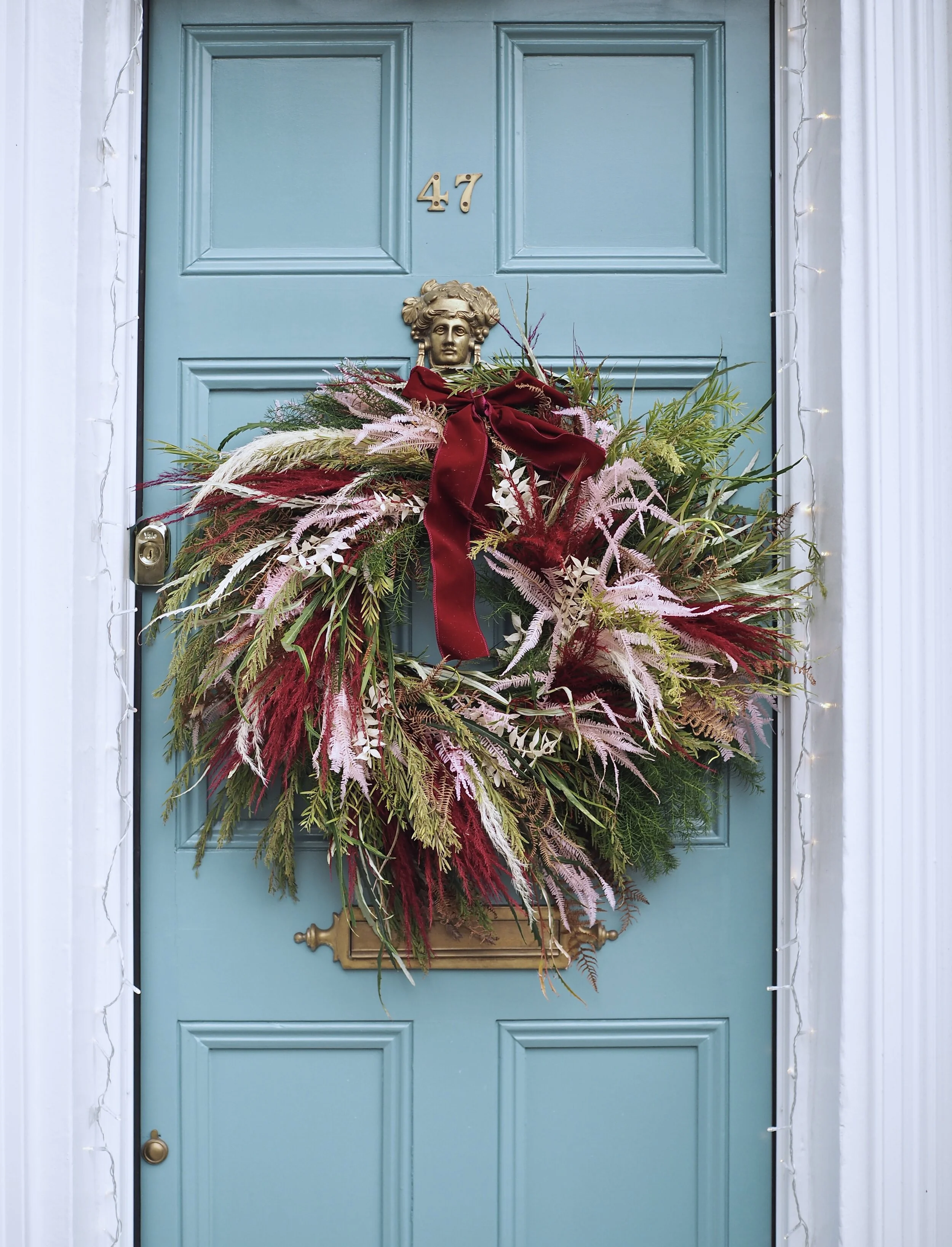 I used to buy my wreath bases pre-made as they always looked so hard to create. I’d invest in a plain moss or pine base, then just add the pretty bits! This year, I decided to make my Christmas door wreath from scratch which was so much easier to do than expected! I felt a huge sense of creative achievement building this dyed pink fern and burgundy pampas wreath from bare-bones, so today on the blog I'm sharing my guide on how I did it.