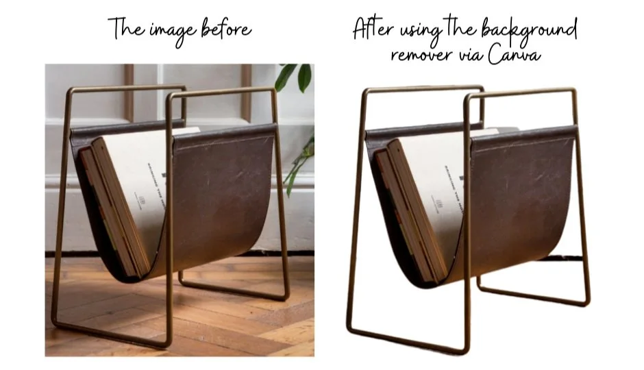 You can use online programmes such as Photoshop or Powerpoint, but I always use Canva - a brilliant graphic design platform that is easy to use and navigate. One of the best things about Canva is its ability to remove the background from any image. There may be a piece of furniture that you want to add to your mood board, but the image on the brand website is lifestyle (shot as part of a wider image) rather than a cut-out (which looks better on a mood board and is easier to combine with other items). While you can find other background removers online, the BG Remover tool on Canva gives a correct, clean edge to the product you want to highlight.