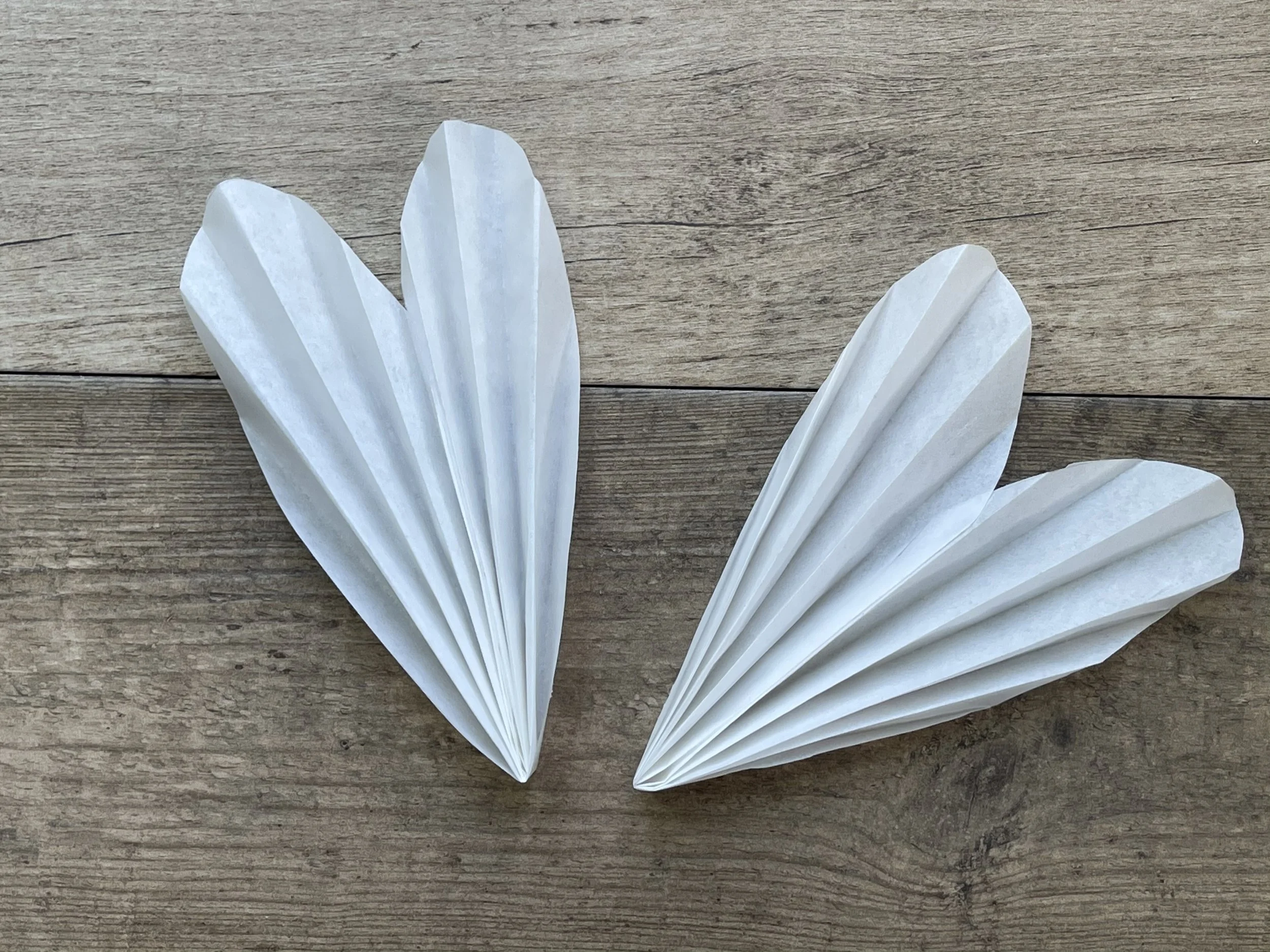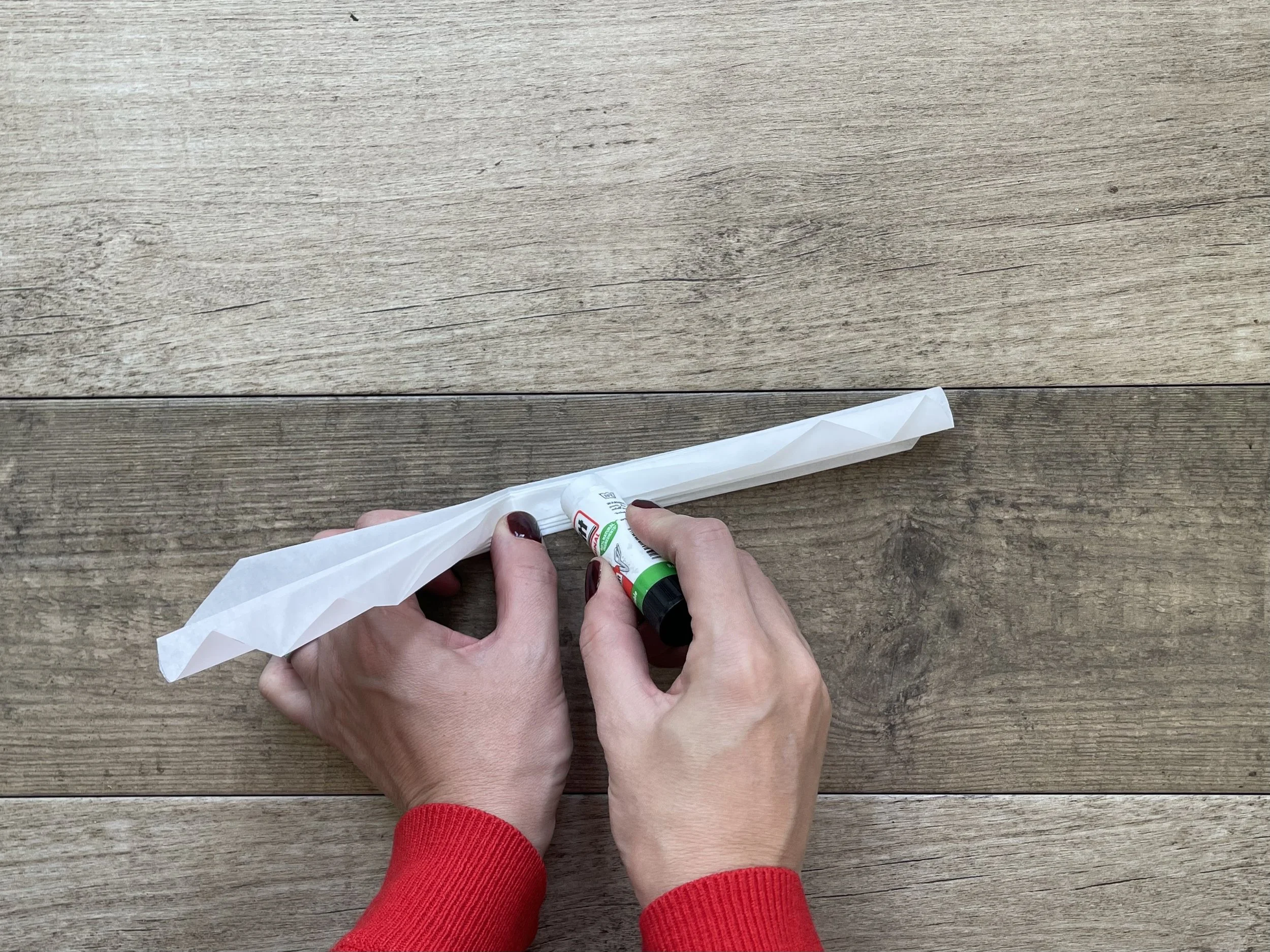 Fold your pill-shaped paper in the middle, so that the two tip points meet equally. Use a glue stick down the inside fold to join each side together to create a heart shape.