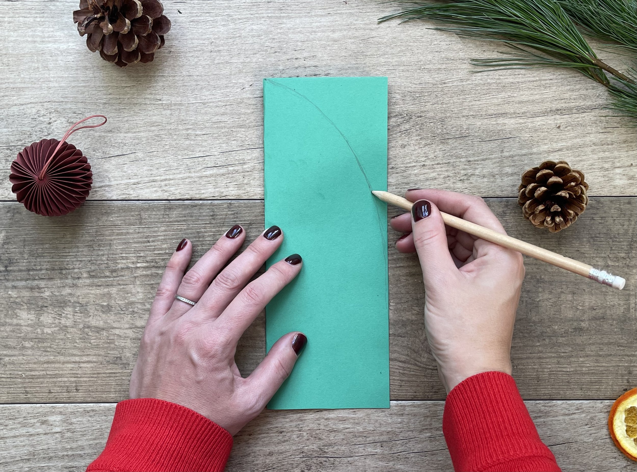 Fold your four pieces of card in half. Using your pencil, draw an arched shape (starting at the top folded corner down to the opposite bottom corner). Cut it out to create the shape of an arched door: