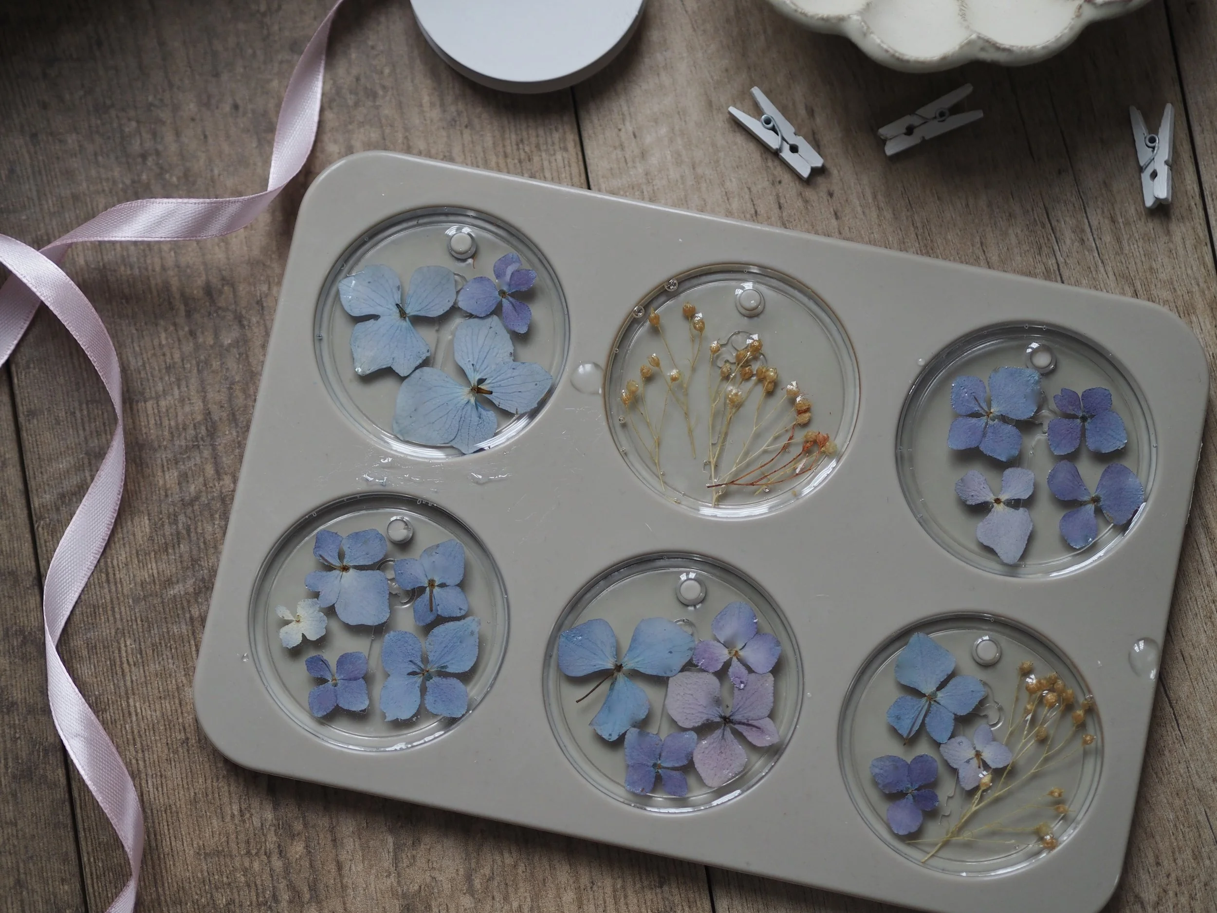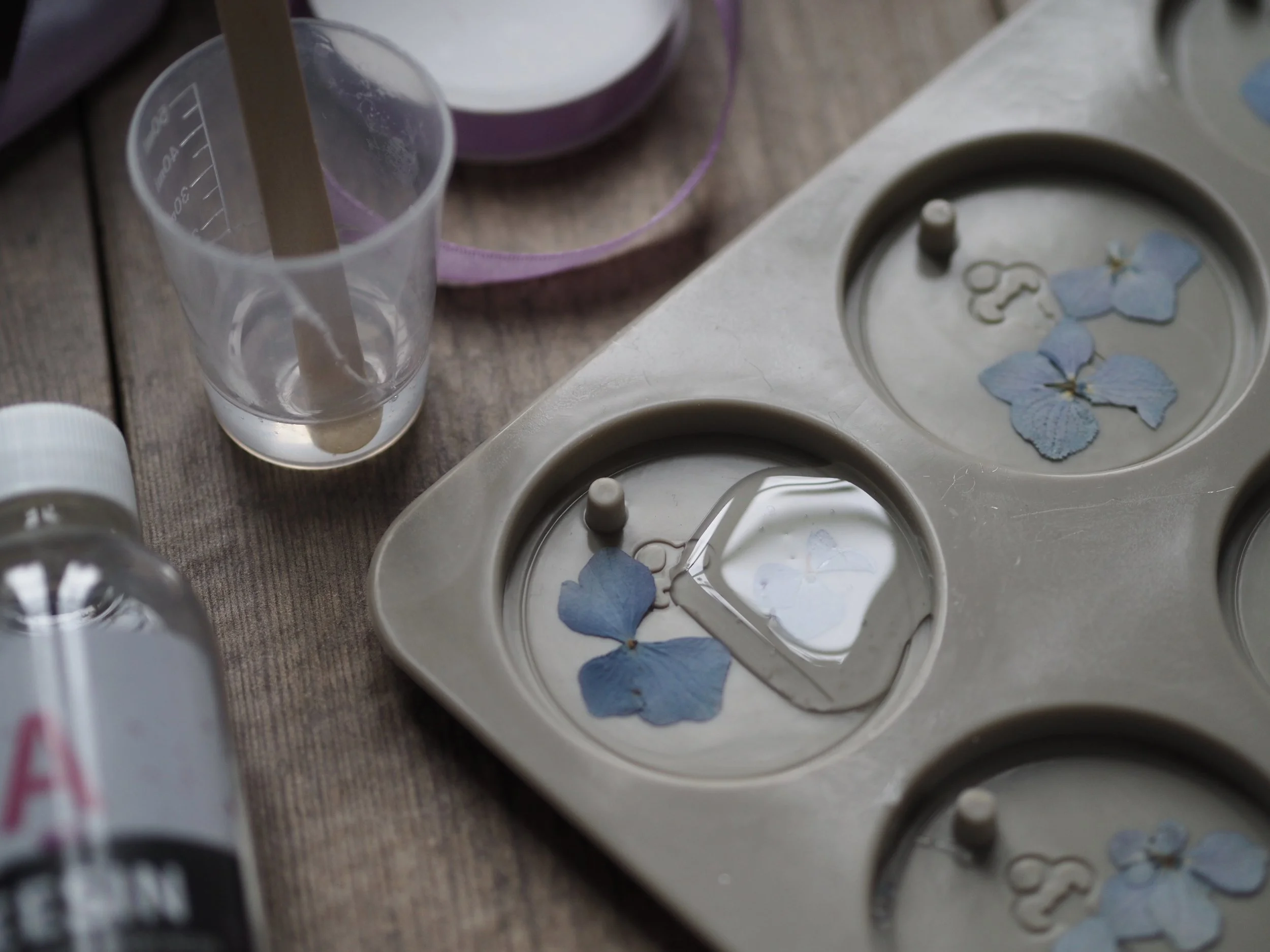 To start, place your pressed hydrangea heads in the silicone mould. I found that they start to ‘float’ when the craft resin is applied, so I didn’t need to apply a thin layer of resin in the mould base first before adding the flowers (because of this, keep an eye on the petals while the resin is developing and dip and shuffle them around with tweezers if they move before the resin starts to set).