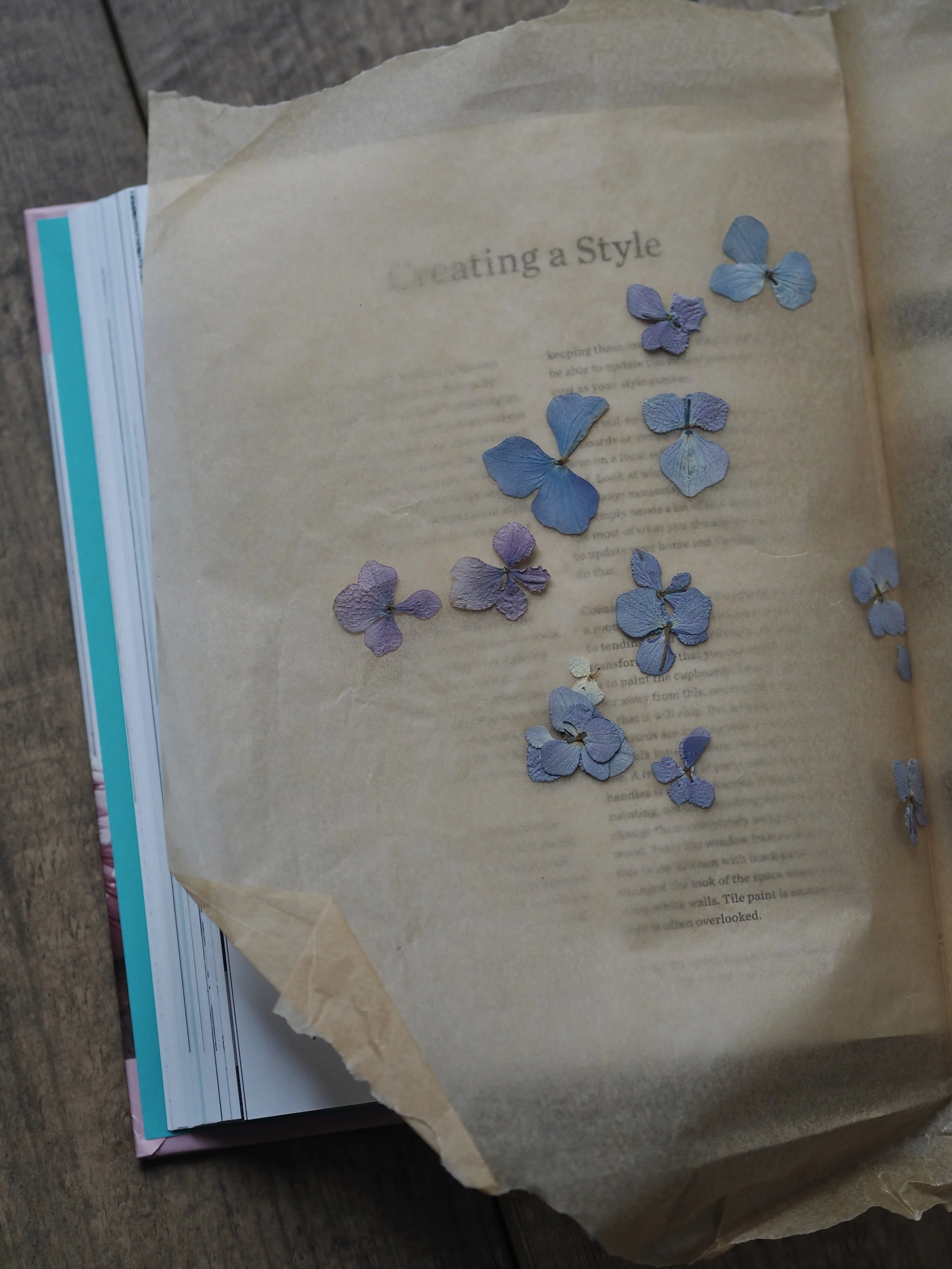 I really wanted to try and preserve some of the pretty petals from my abundant supply of garden hydrangeas this summer. In August, I picked off a few individual flower heads and pressed them between two sheets of baking paper in a heavy book (and just left them in a cool, dry spot until this week!) As Christmas is upon us, I took inspiration from a vintage paperweight that I saw containing dried flowers and decided to give resin craft a try for the first time by capturing my pressed hydrangeas as Christmas baubles and delicate gift tags.
