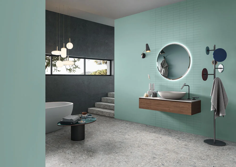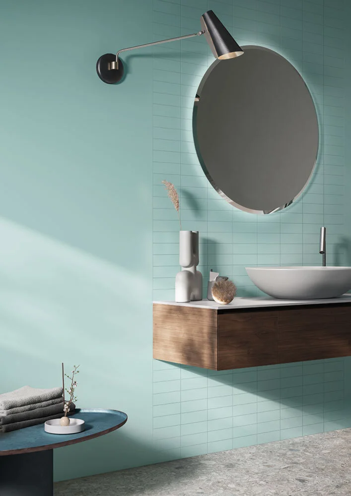 Blue and green tones that reflect nature are revitalising and reassuring, so choose tiles in hues that imitate the natural world and connect us to the tranquillity of the great outdoors. Avoid synthetic, vivid tones and lean towards soft, organic colours that are welcoming and refreshing. Deep, blue-based greens that emulate the bottom of the sea, along with muted blues that reflect the softness of the sky, are colours that surpass trends and provide a calming, soothing environment (especially in a bathroom where running water is incorporated).