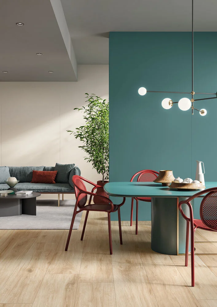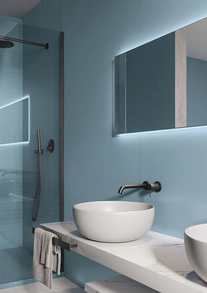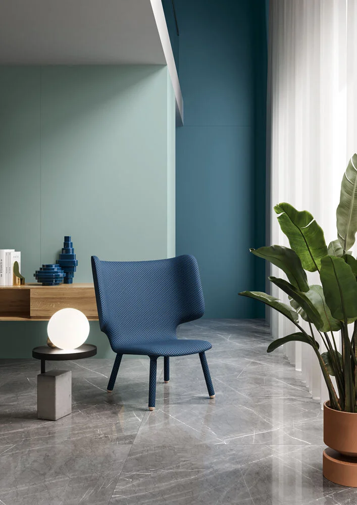 Green and blue are the perfect pairing if you want to use more than one colour in your design. Flooring: Marmosmart Fossena; Wall: Oltremare (back) and Fiordaliso (front)