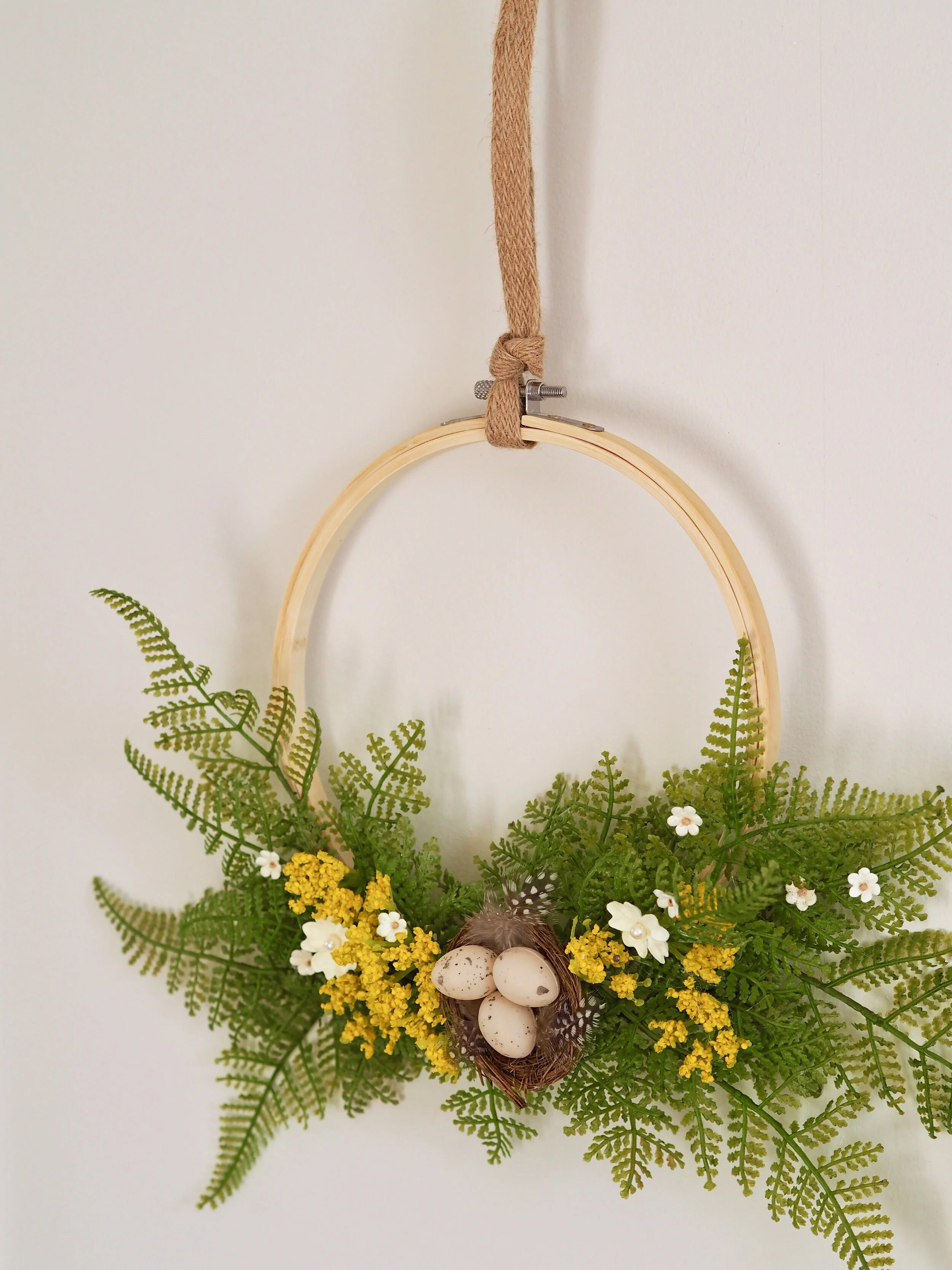 Glue some decorative eggs and feathers in the nest, then attach the nest to the design. Apply the last remaining flowers, then tie your jute ribbon to the top to hang your decoration.