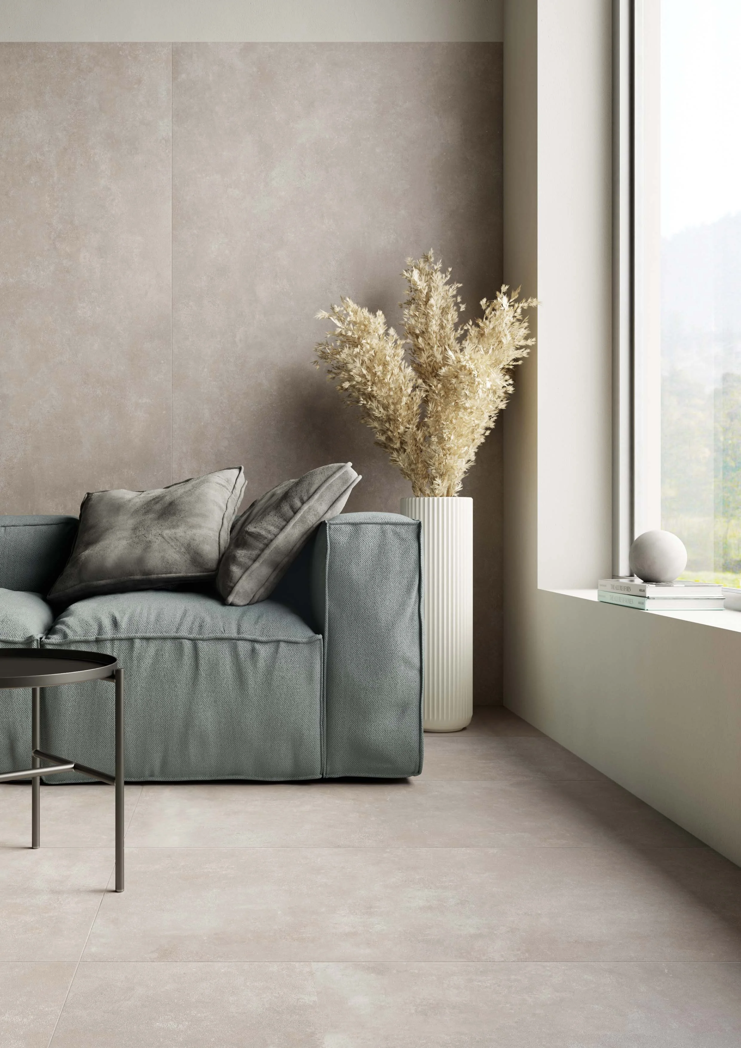 Metropolis Greige by Casalgrande Padana is the perfect accompaniment to the far walls painted in a warm neutral as they both have the same base colour and tone.
