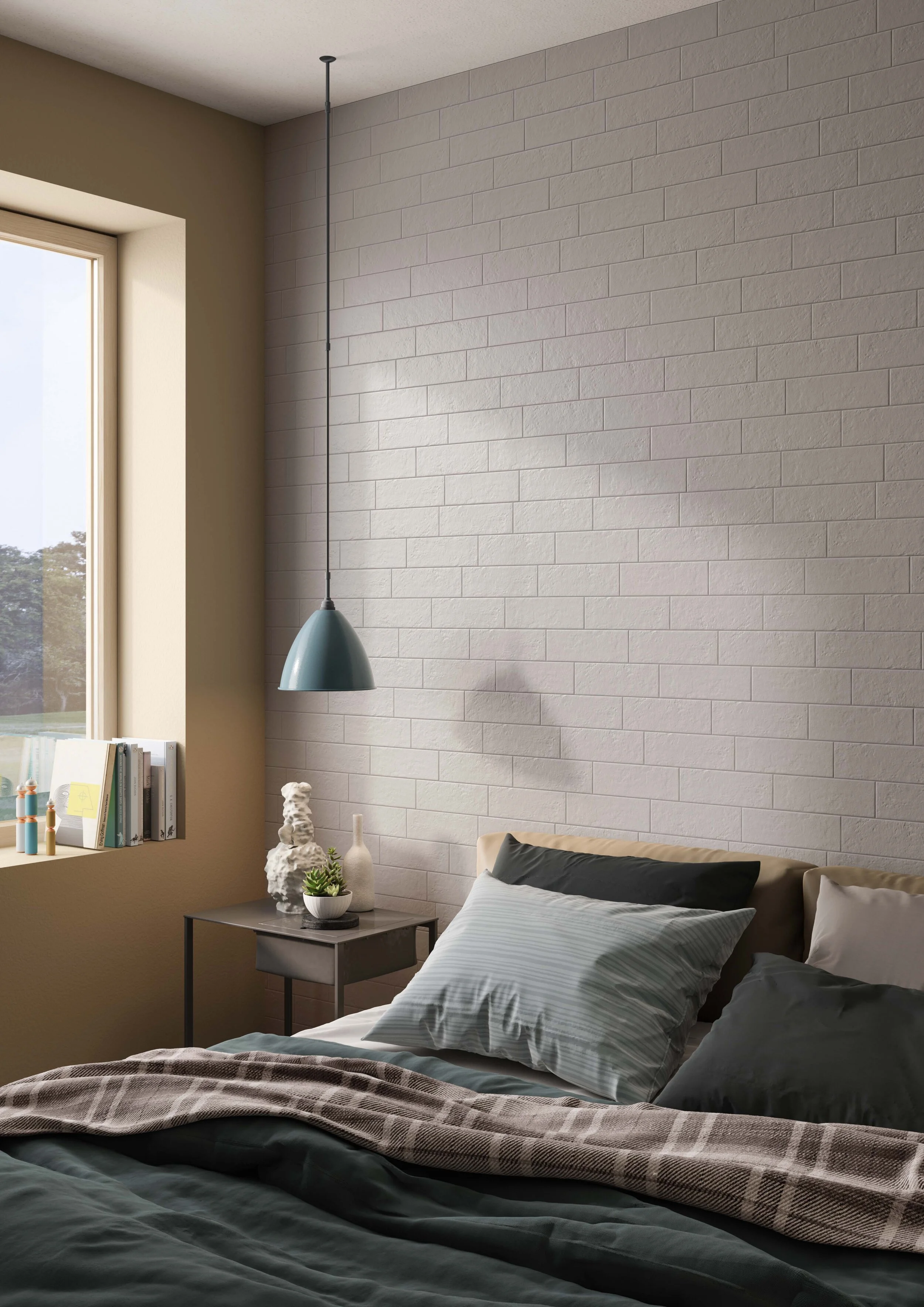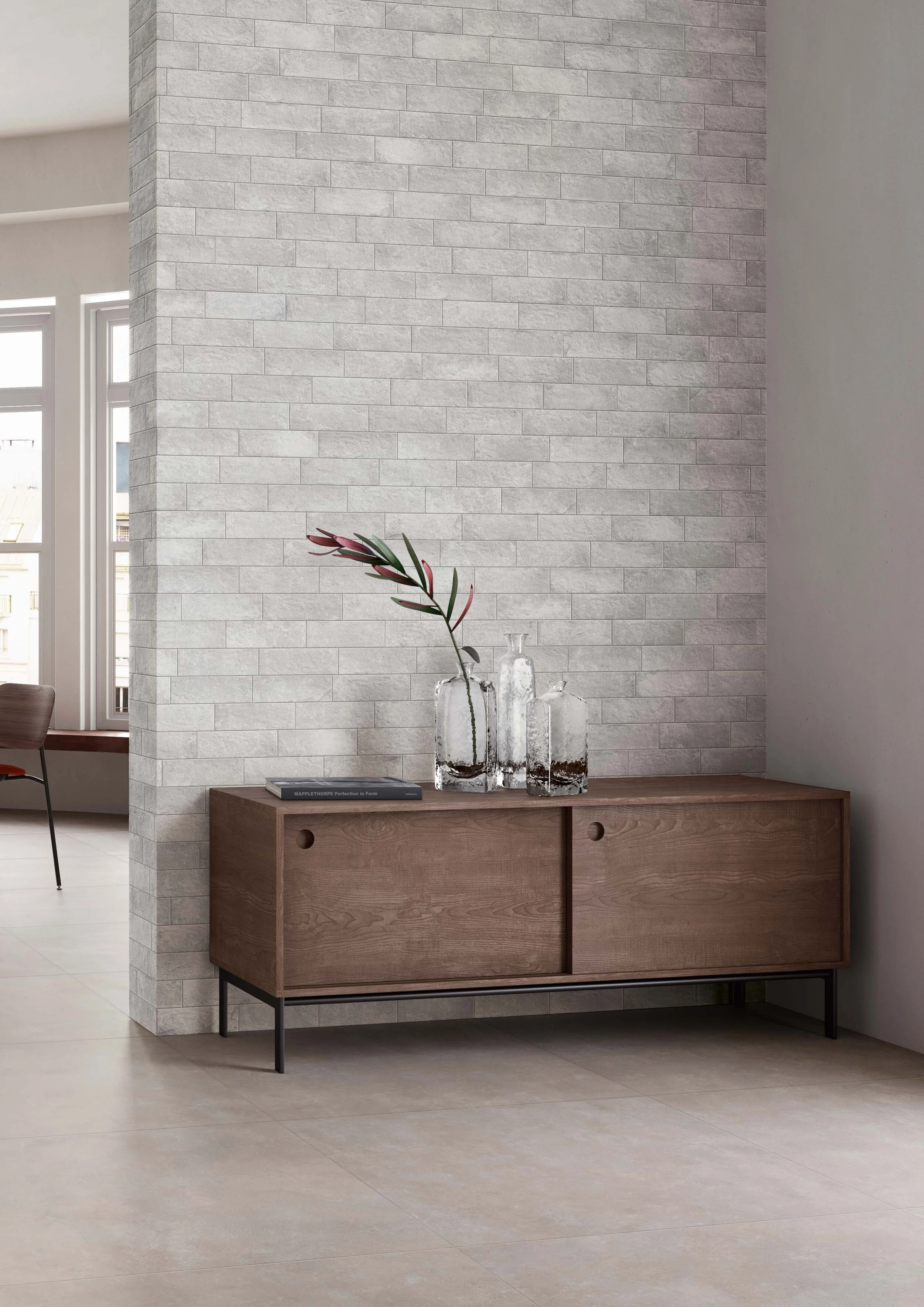 Create a brick-effect wall with Casalgrande Padana’s ‘Muretto Grigio’ metro tile (part of their Brickworks collection), applied in an offset brickwork pattern.