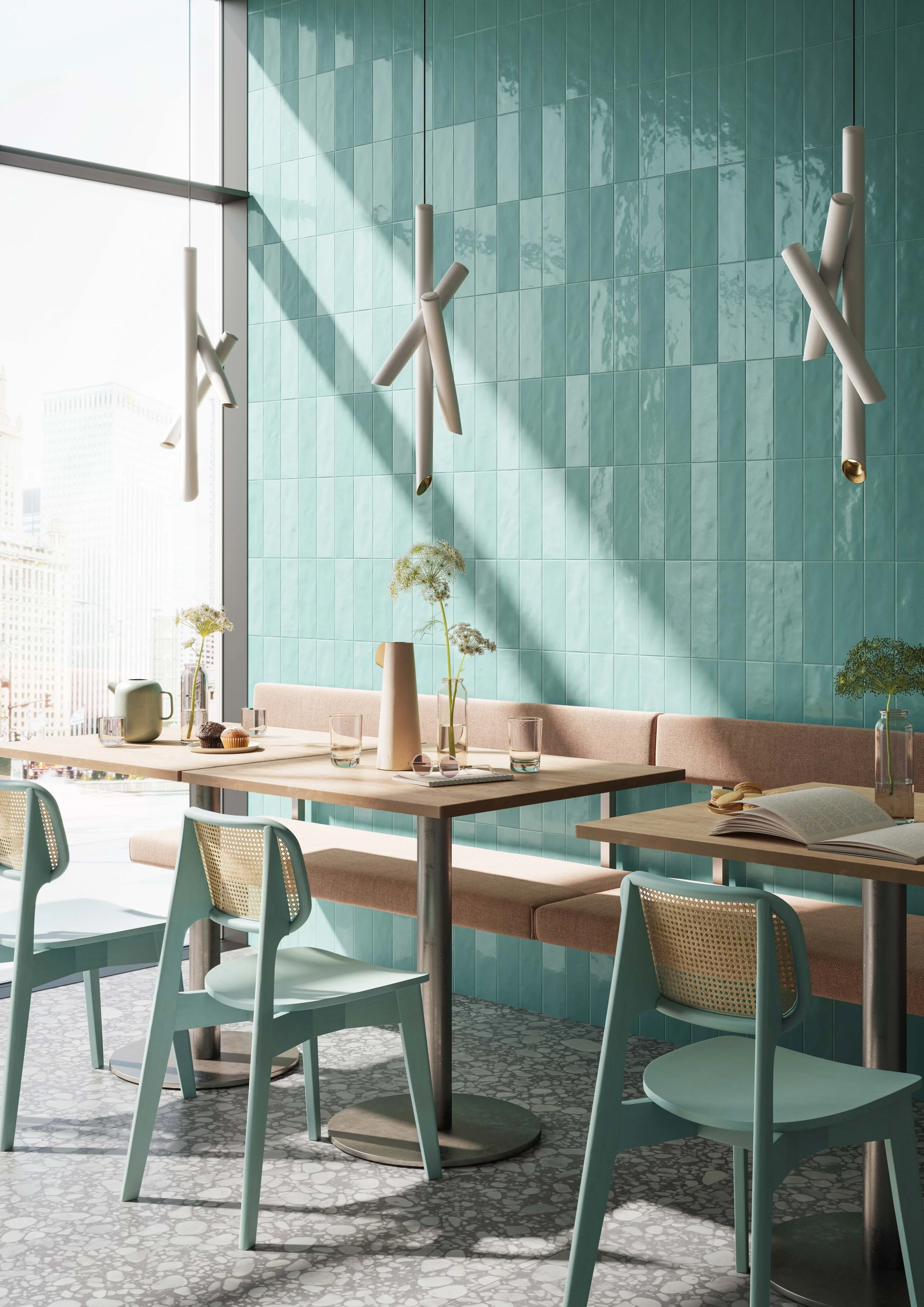 ‘Nuances Verde Persia Satin’ are mixed with ‘Verde Persia Lux’ to intertwine and provide the perfect backdrop for the blush upholstery in this modern cafe.