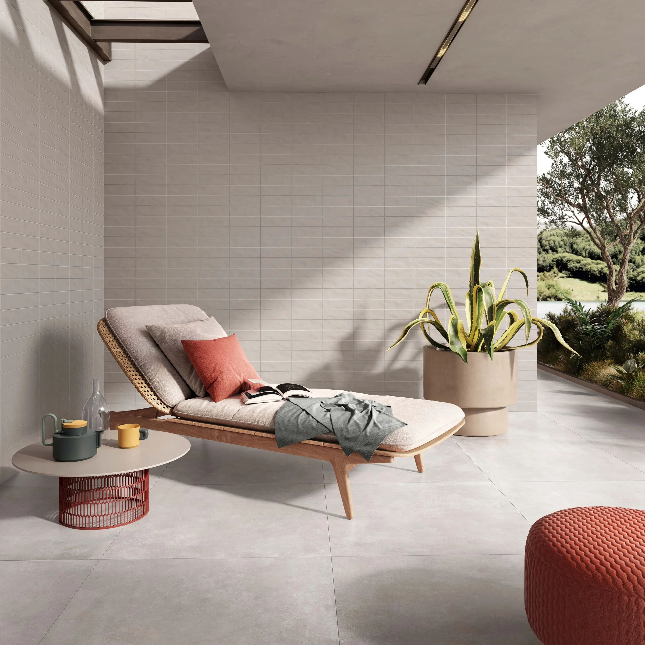 Create a cool, light and airy patio area with ‘Nuances Cameo Satin’. Floor: ‘Metropolis Grey.’