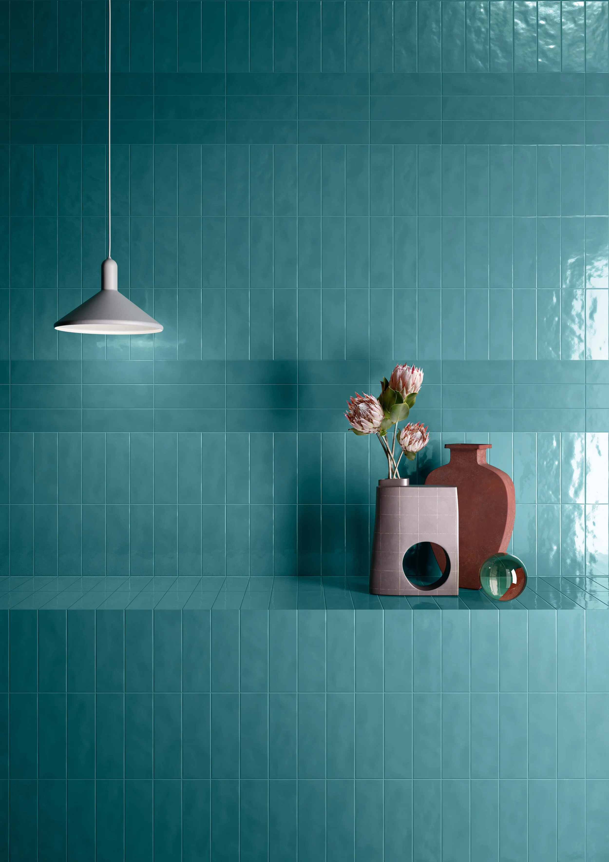 You can combine colours when stacking, or use block colours for a striking impact. Darker tones look great below eye-level as they add drama and allow other colours to pop out in front of them, while keeping it light on top stops the darker tones from dominating or feeling oppressive. Lighter teal or neutral shades - such as ‘Sherpa’ or ‘Cameo’ from the Casalgrande Padana Nuances collection - can be used in full sections for a modern, contemporary style.