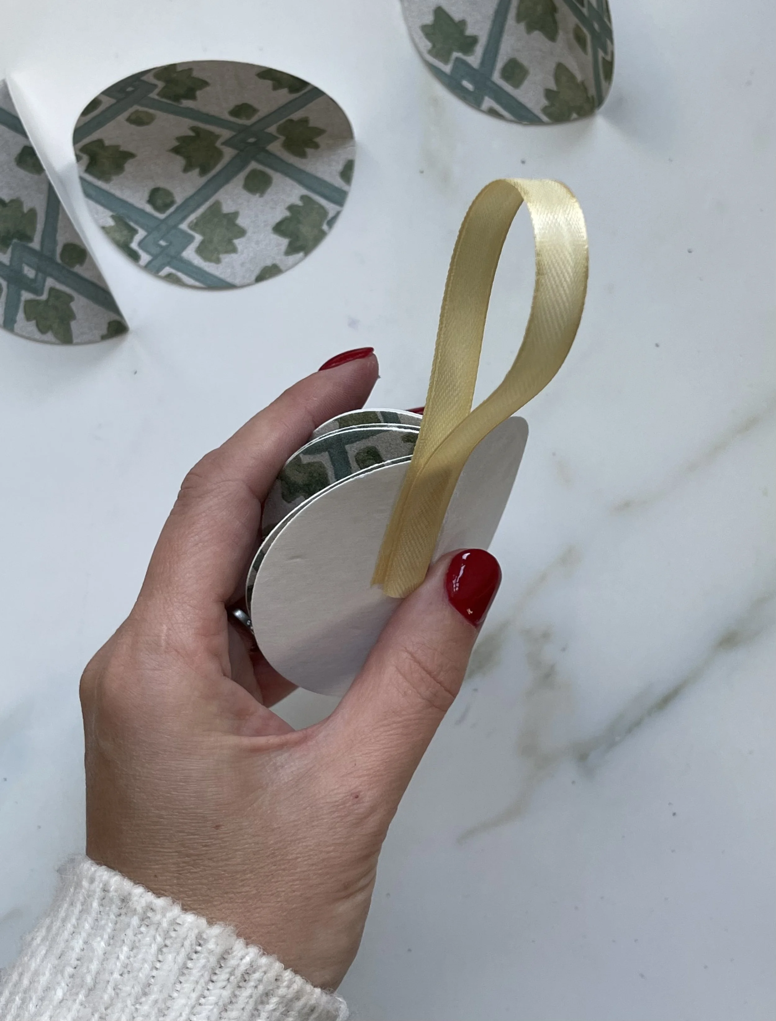 All you need to make these papercraft baubles is a glue stick, ribbon, scissors, wallpaper, and a 3-inch craft punch. The 3-inch circular punch gives you a decent-sized bauble and you can buy it on Amazon.