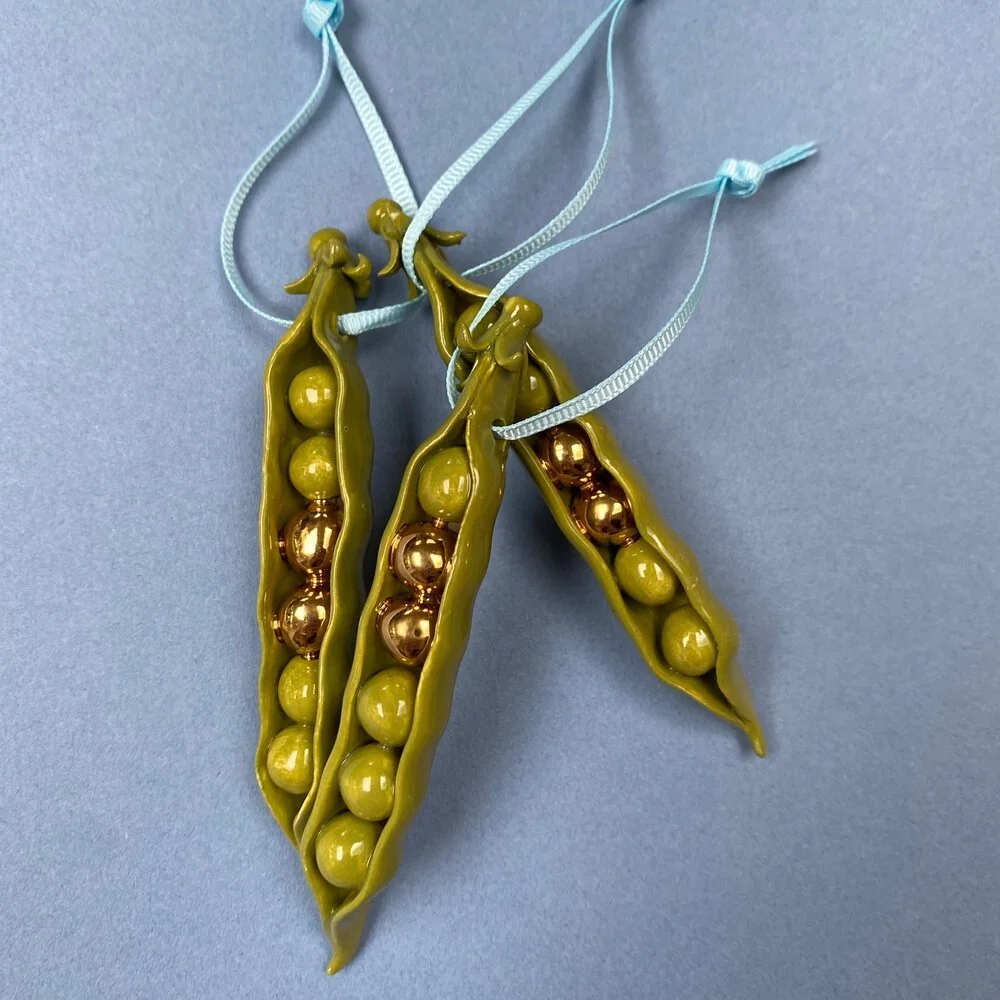 Margate-based ceramicist Minnie-Mae makes some really gorgeous things and her Christmas decoration offering this year of two gold peas in a pod is both beautiful and original. Featuring two 24ct gold lustre peas in a pod, each is hand-rolled using clay produced in Stoke.