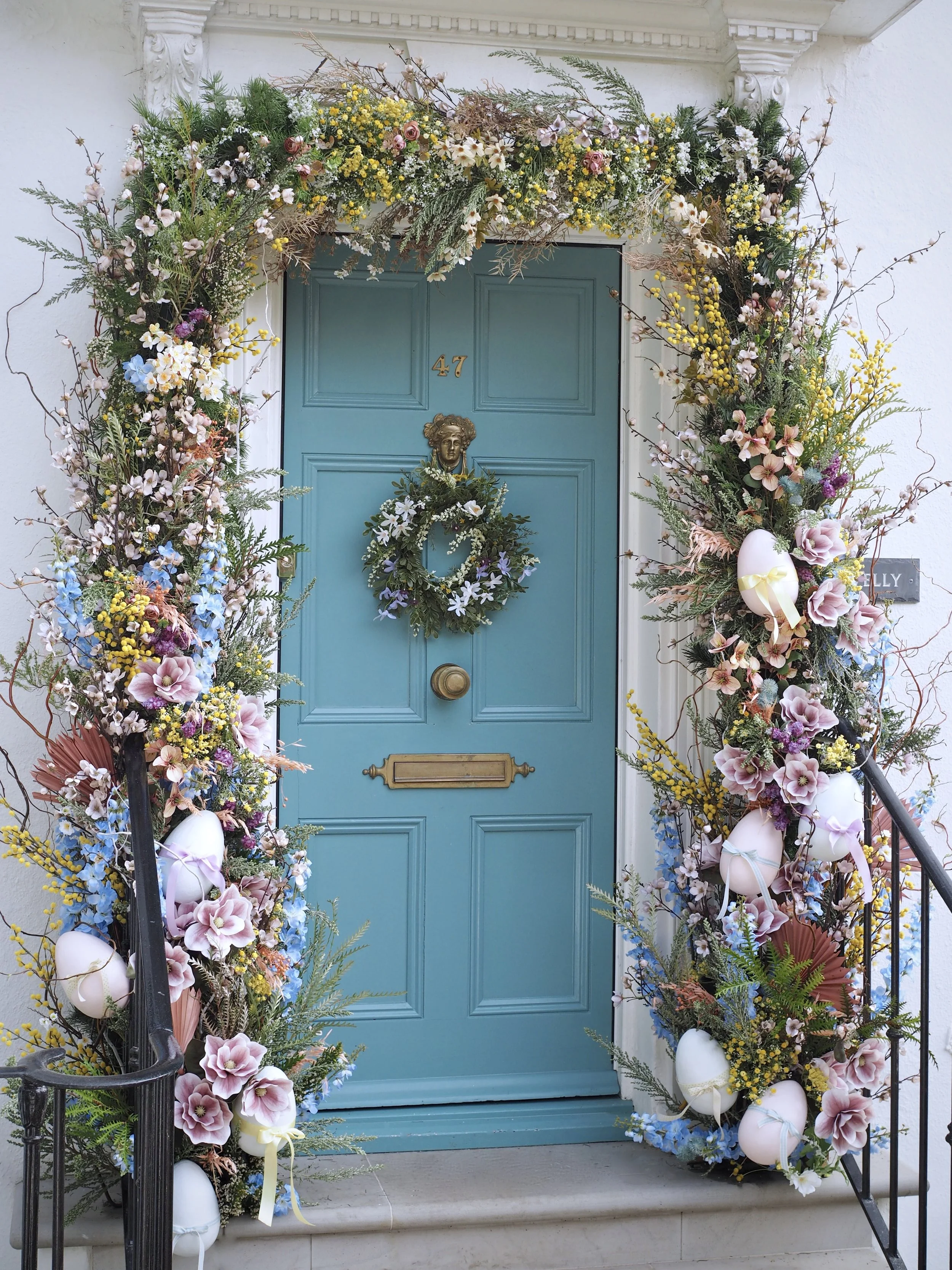 I wanted to make it bright, cheery, and spring-like for passers-by to enjoy, so I used a range of faux flowers from Dunelm: magnolia, delphinium, mimosa, and cherry blossom make up most of the design, while I also painted some polystyrene eggs in pastel shades (colours from Dunelm’s Decorate & Co-ordinate paint range: 'Pale Sky' and 'Rose Water') to accentuate that this was an Easter decoration (when Easter passes, I’ll just remove the eggs and keep the doorscape up longer as a spring decoration).