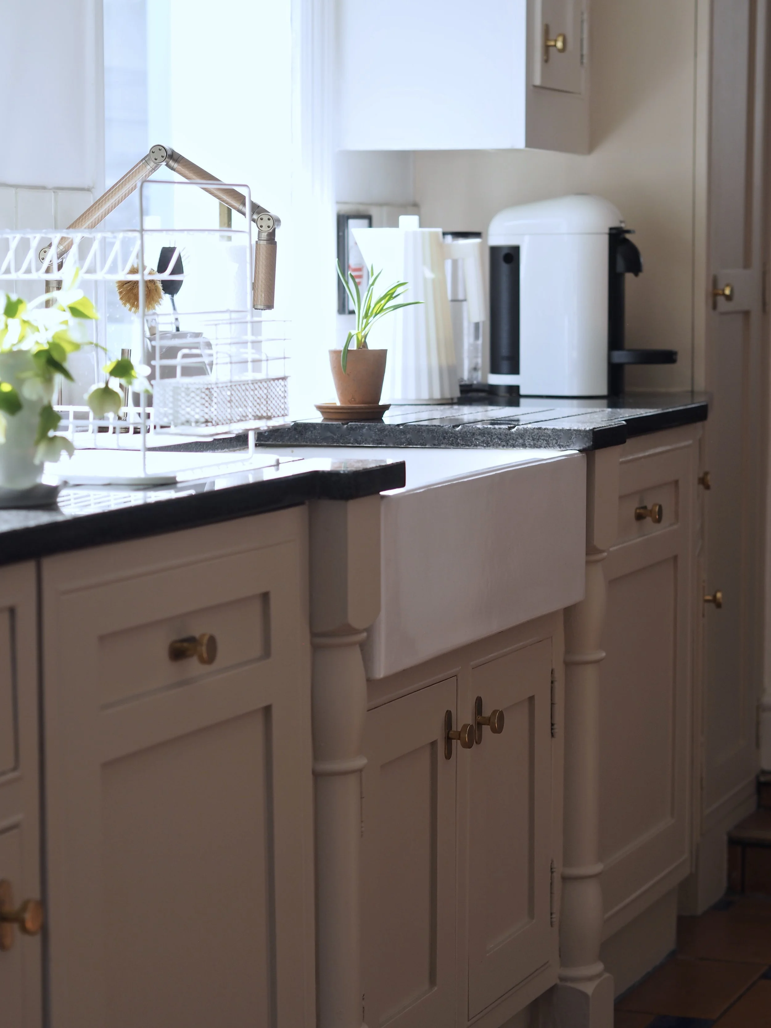 I’d been contemplating what colour to paint the cabinets since I had decided that the light blue wasn’t really working for me. I wanted to keep the kitchen feeling bright, so I discarded the idea of painting the bottom units a dark colour again (they were dark navy blue before they were light blue). Although I was steering away from the dark, I did still want a deeper hue on the bottom units for visual interest and to add a layer of warmth to the kitchen. I had been really drawn to the vast amount of cashmere and taupe kitchens that kept popping up on my Pinterest account (these warm neutral shades were light but had that depth of colour that I was after). I knew that I wanted to use Rust-Oleum’s Kitchen Cupboard Paint again after using it last time: the coverage was excellent, there is no requirement for a primer, and the paint is touch-dry within an hour (such a huge bonus when you have a family kitchen being used every day and it’s impossible to leave a standard eggshell finish to fully cure for a week when the space needs to be used). Even though I wanted to change the blue colour, there was hardly a chip in the previous Rust-Oleum paintwork, so I knew it was also really durable. After testing out a few colours, I decided to go for the shade ‘Butterscotch’ on all the base units (I just touched up the top units previously painted in ‘Steamed Milk’).
