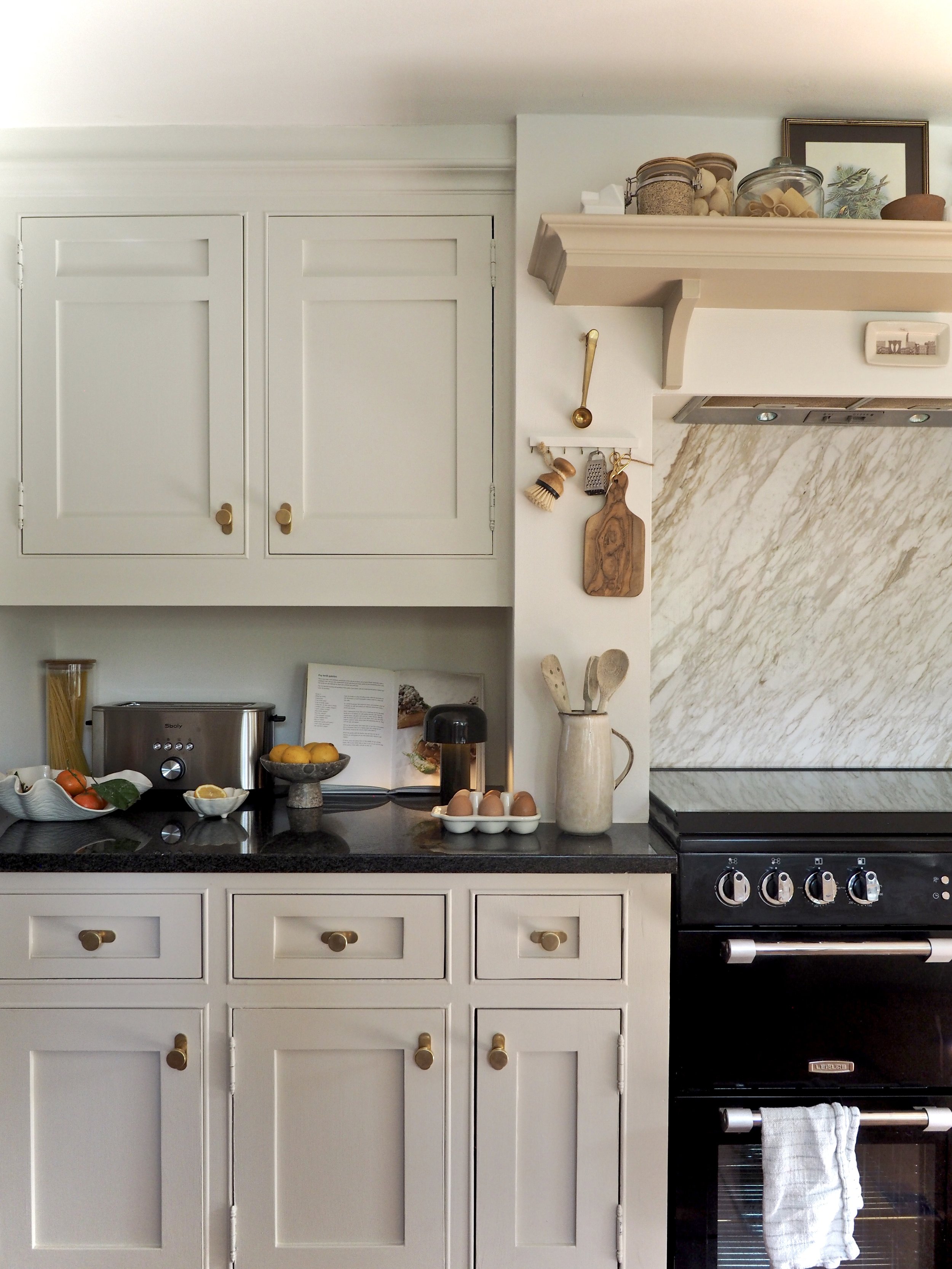 My beautiful antique brass Kilburn knobs from Corston Architectural Detail are meant to gain a natural patina over time, but as I had to remove them to paint the cabinets I gave them all a buffering using Bar Keepers Friend to remove any finger marks and discolouration and return them to their full glory. One of the best things that you can do to give your kitchen a new look is to upgrade the hardware; if your handles are not doing it for you, replace them for a simple but effective update.