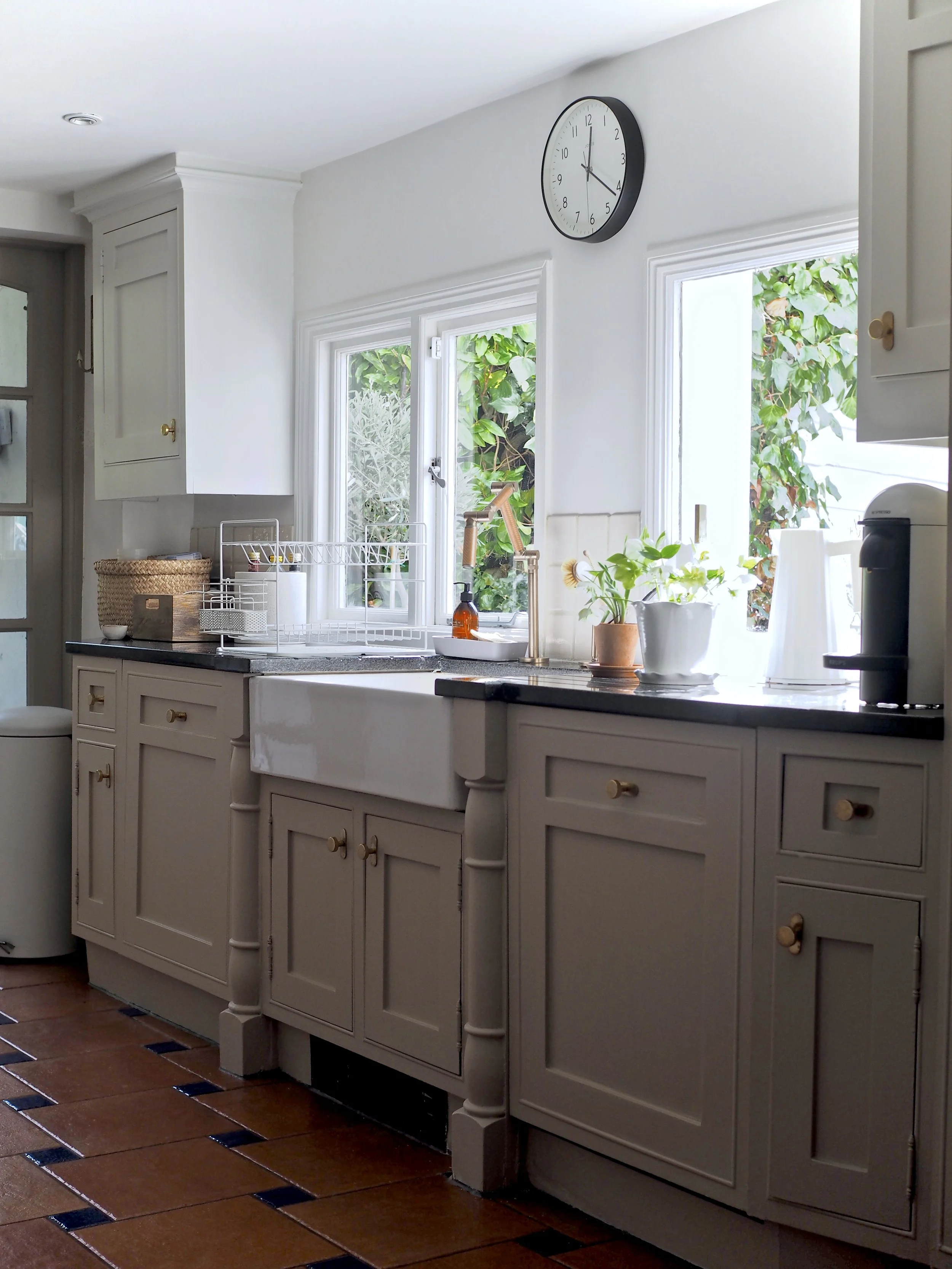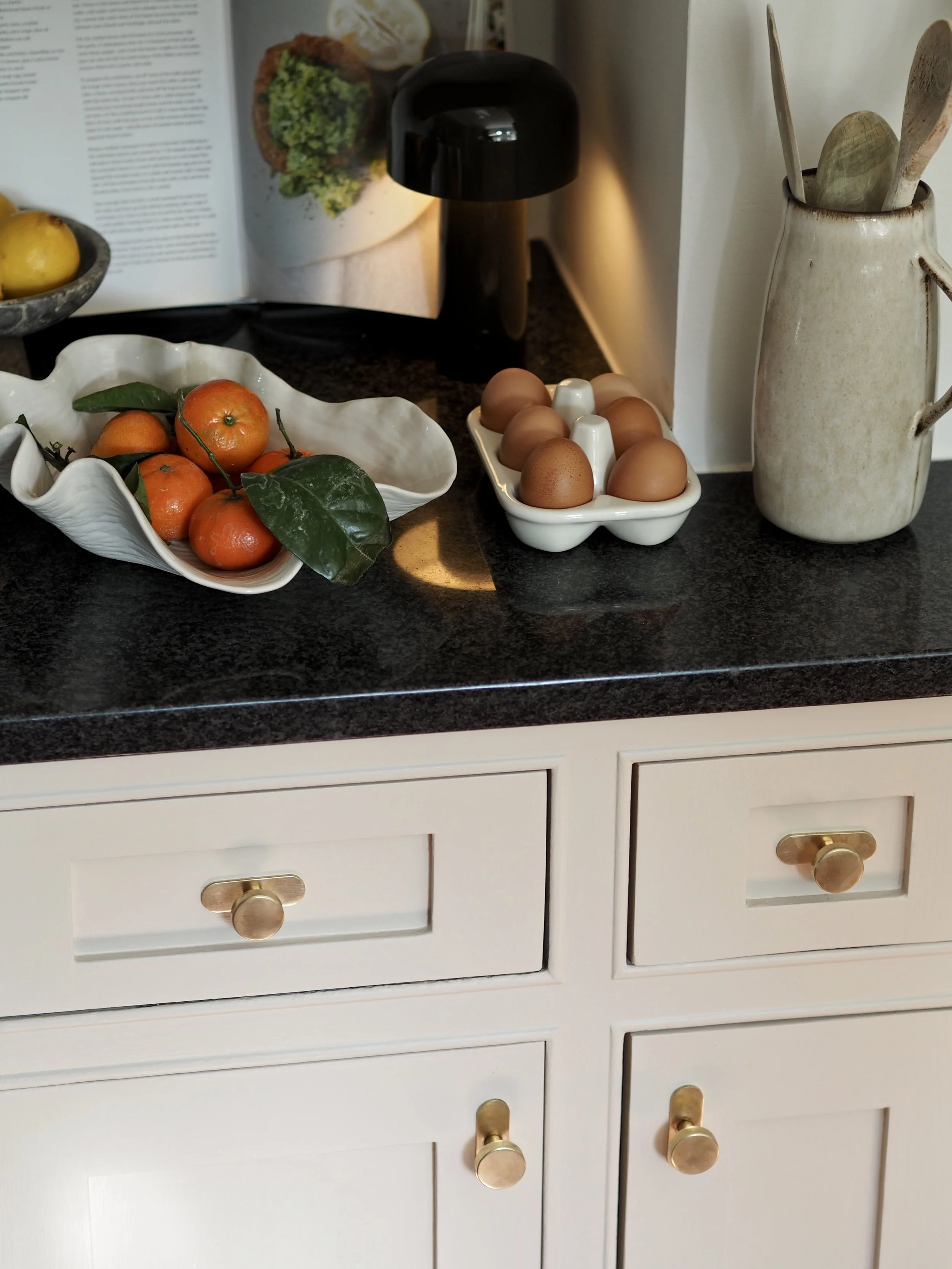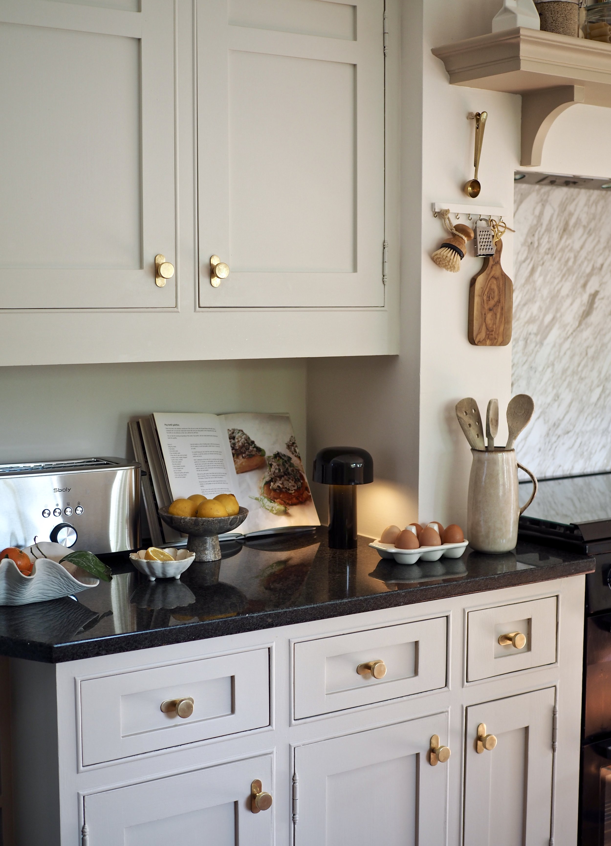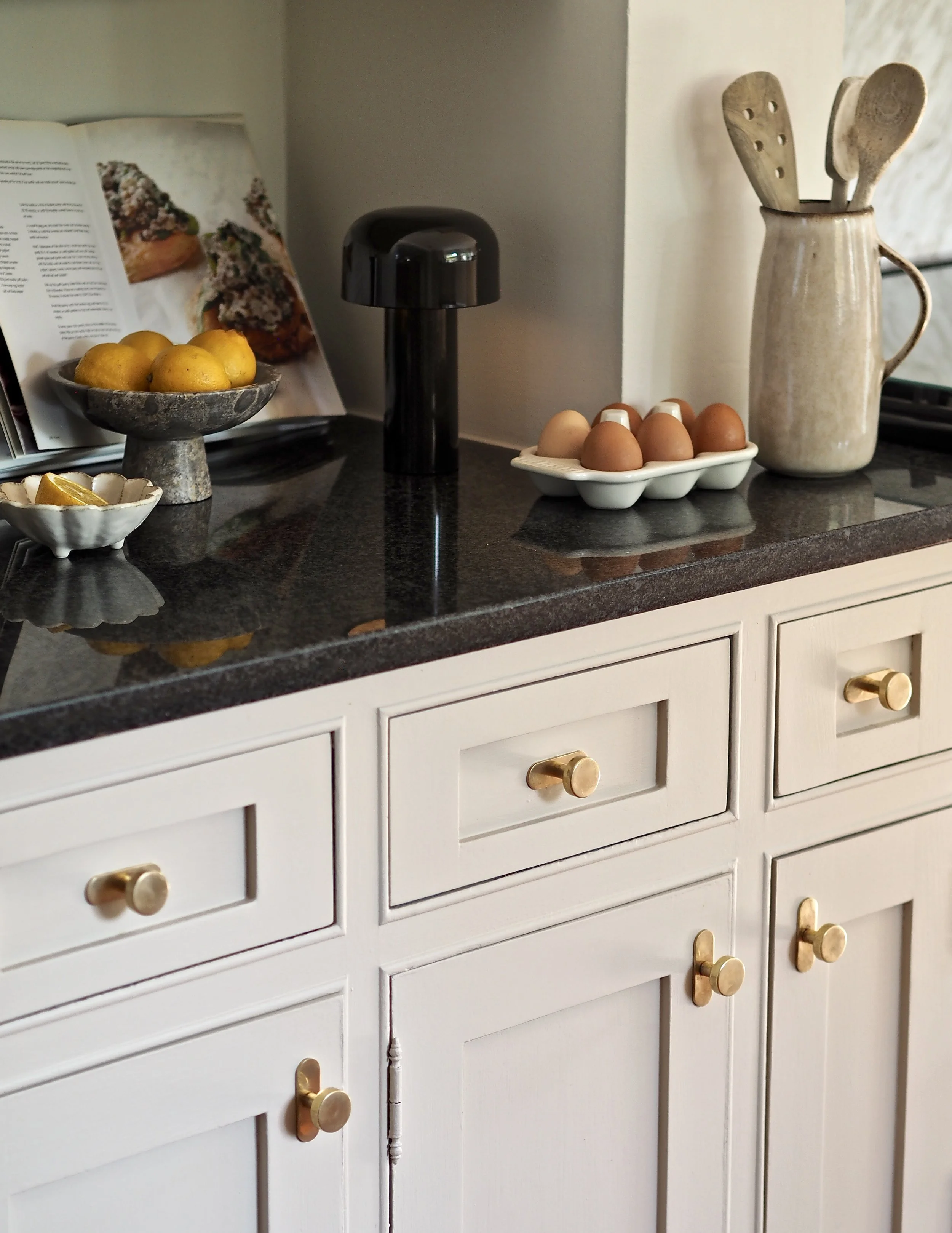One year later, I decided to give my kitchen another facelift. I was bored of the farmhouse-style blue cabinets and mermaid tiles that previously existed - it was time for a new look using contemporary warm neutral tones and a swap out of the old tiles for an on-trend slab splashback. The only thing I didn’t want (or need) to do was to replace my Corston Kilburn knobs. The vintage look of the antique brass finish had gradually gained a soft, darkened patina over time which suited the old kitchen style, but when I removed the knobs to paint the cupboards I just gave them a quick buffing with a microfibre cloth and brass polish to reinvigorate them to suit the refreshed space. The Kilburn knobs worked so well in the ‘farmhouse’ kitchen, but also crossed over to suit the new neutral aesthetic beautifully. Removing them and re-applying them was easy - I only required a manual screwdriver to do the job.