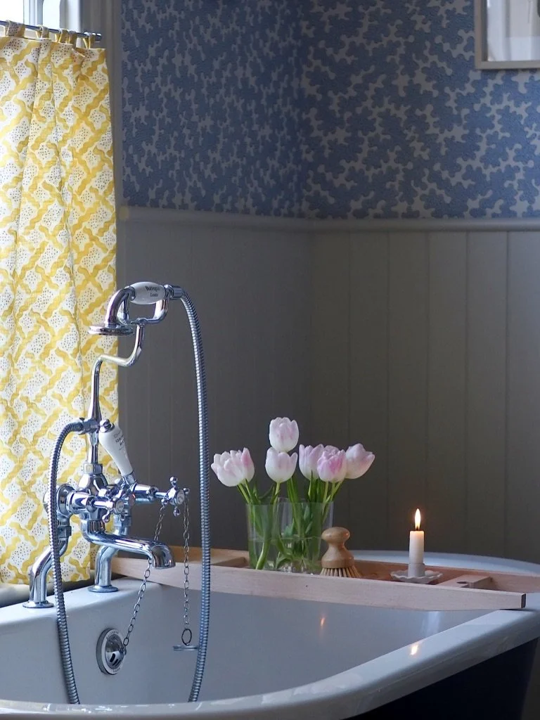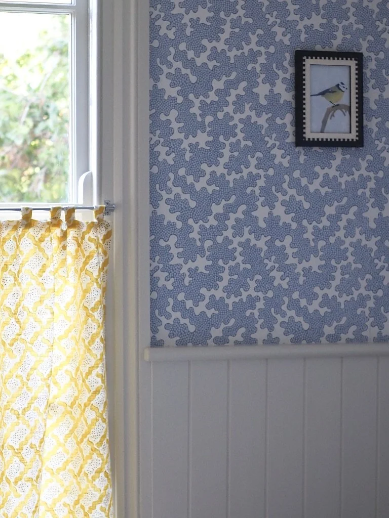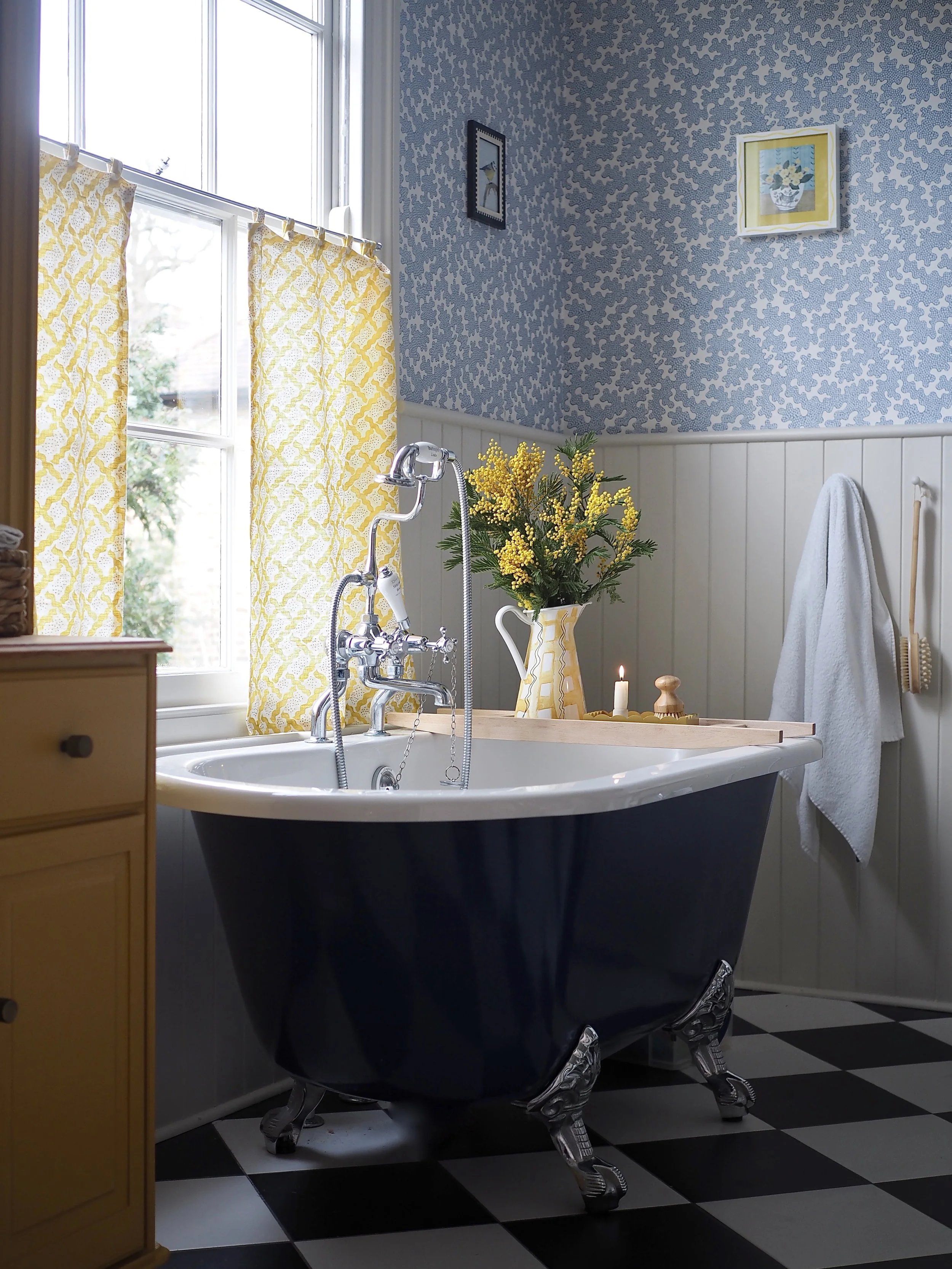 Last month, I was really happy to finally finish off my bathroom renovation by making and installing some yellow cafe curtains over the sash window. Cafe curtains are having a bit of a ‘moment’ within interiors; they are eclectic and whimsical and embrace the current trend for traditional interior design. Practically, for me, they were the perfect choice to add a bit of pattern and texture within my bathroom, as well as keeping the top half of the window clear to still let in as much light as possible.