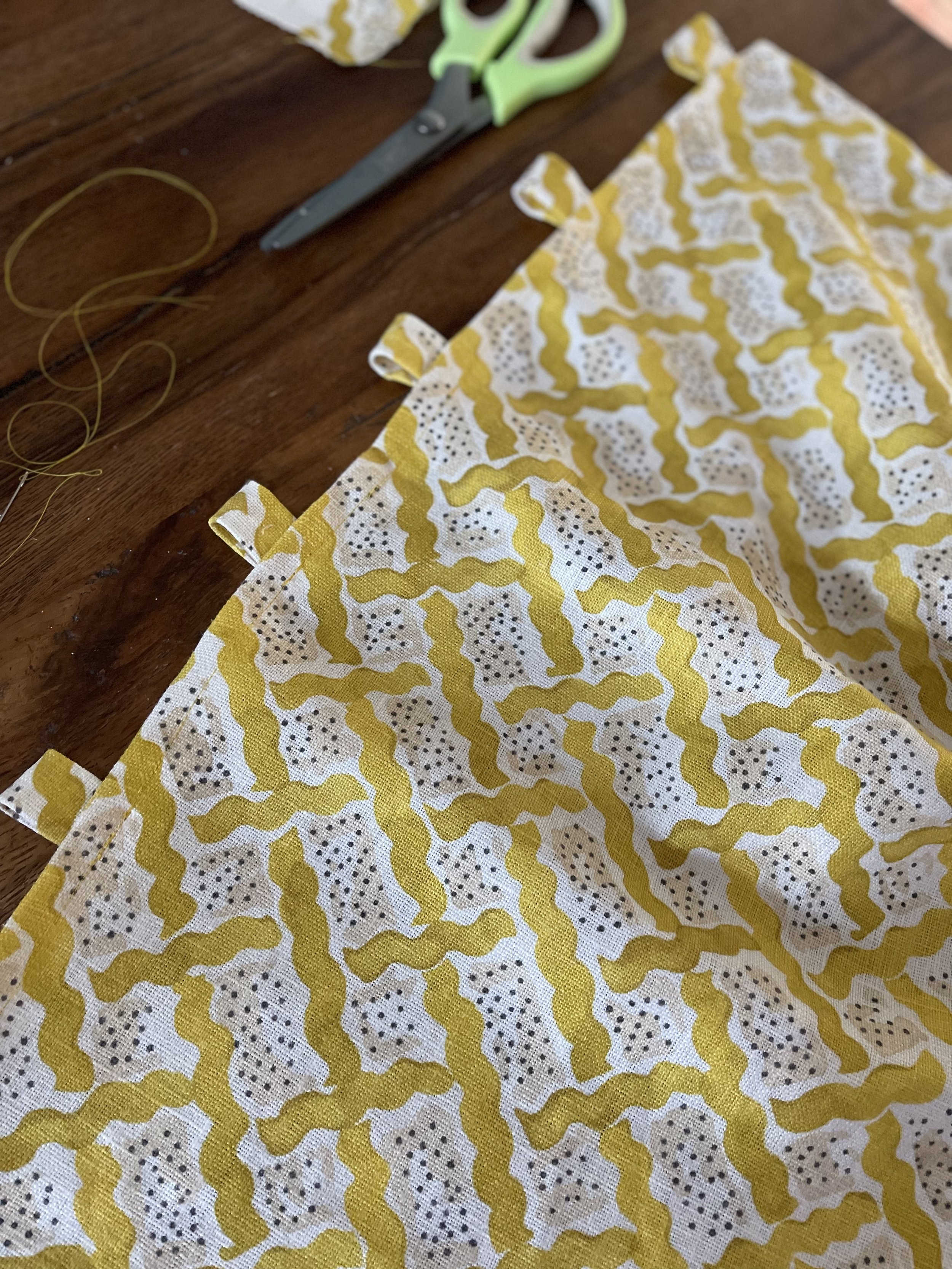 I really liked my cafe curtain rod, so I didn’t want to ‘hide’ it by hemming the fabric around the pole. Instead, I created little fabric loops which I folded over and pinned to the underside of the curtain (making sure they looked OK on the rod before I sewed them on). If you like this look but do not feel confident creating the loops, an easy way to install a cafe curtain without sewing is via cafe curtain hoops and clips.