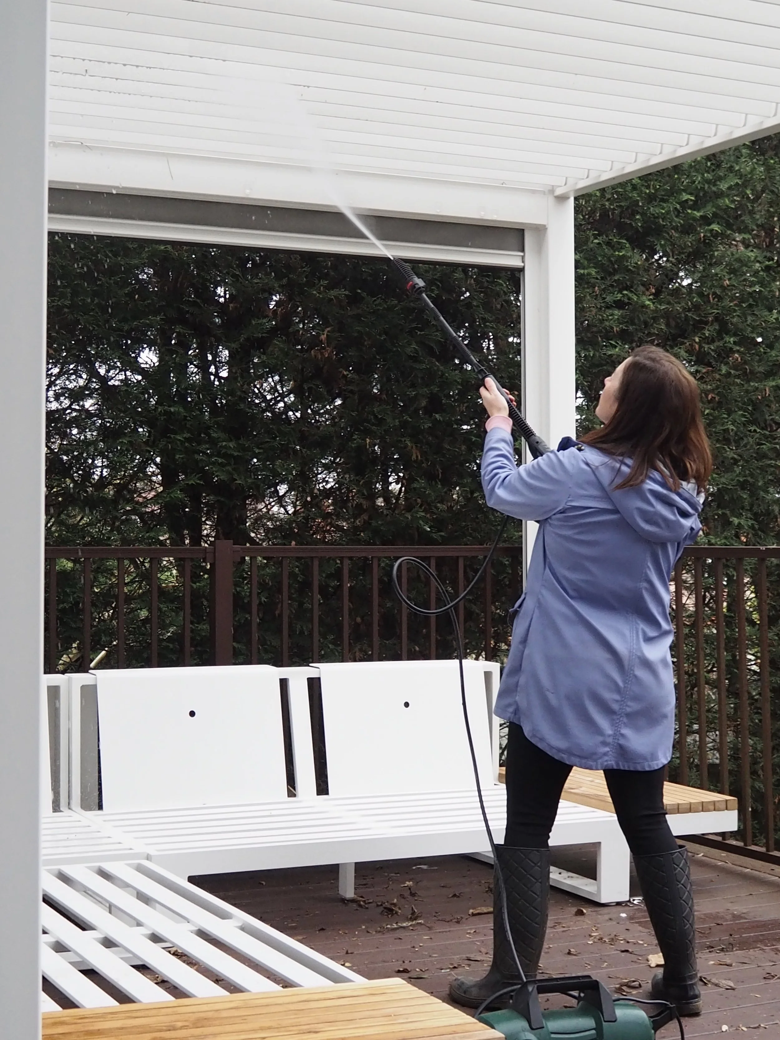 I love white garden furniture - I think it looks great as it pops out against the green lawn and trees. I have two white garden armchairs in my courtyard and a white pergola and outdoor corner sofa set on my raised decking area in the garden. However, white garden furniture really does highlight garden dirt and debris so it needs to be cleaned regularly. All of my white garden furniture is made from metal so it is easy to clean with a simple pressure washer. I use a mid-range Bosch pressure washer that retails for around £60 and this works brilliantly for me for getting my outdoor garden space looking like new.