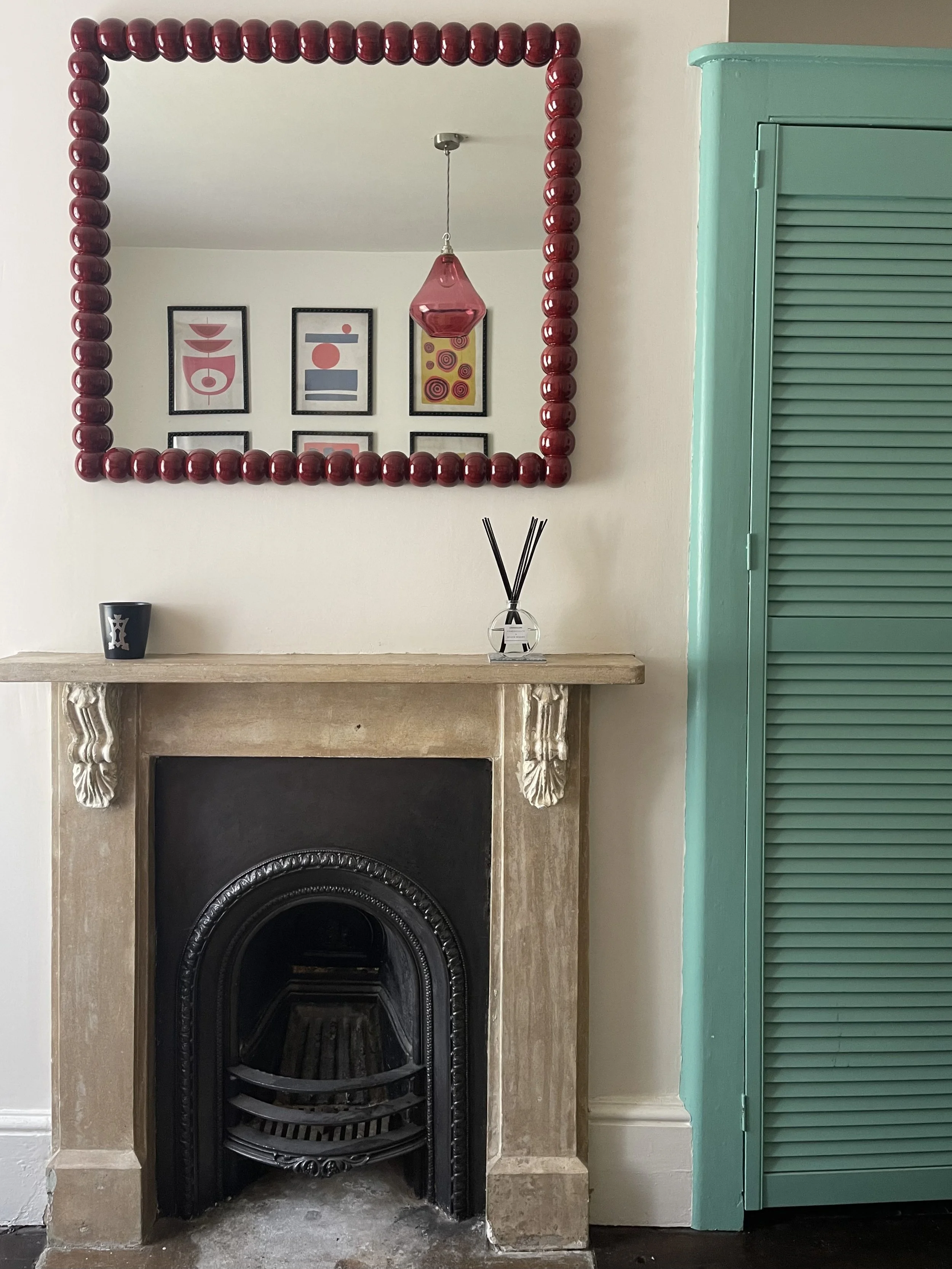 This red wood-turned mirror and built-in cupboard in mint adds charm and personality to this guest room designed and owned by textile print designer Camilla Ruiz Ramirez.