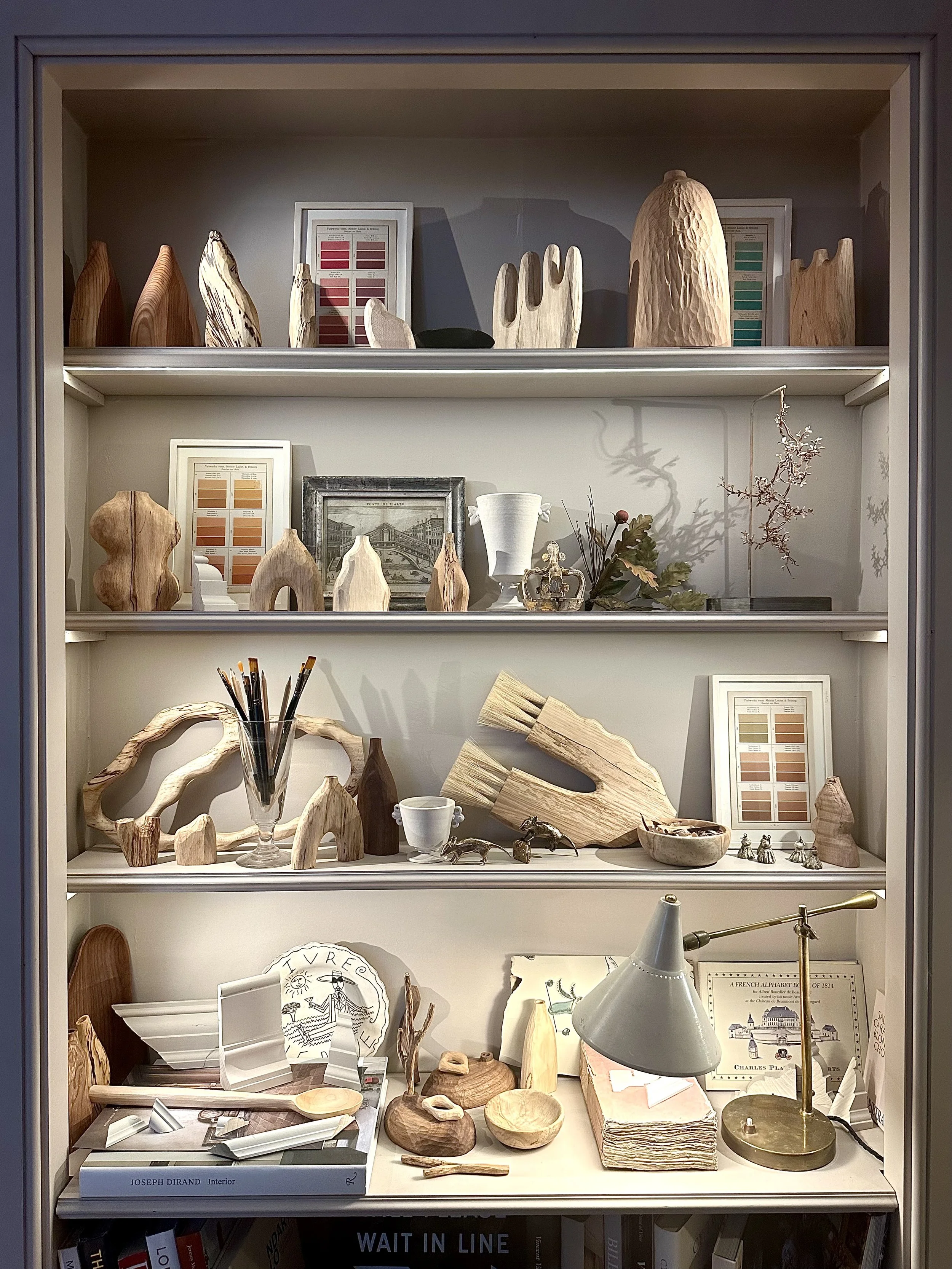 The Entrance Hall, designed by Victoria Davar of Maison Artefact and sponsored by Cox London, was a grand, dramatic affair, with tall ceilings and a floating staircase. It was a feast for the eyes, featuring a wonderful array of ceramics (this room introduced me to the potter Charlotte Mcleish and artwork by Dominique Fuglistaller), but what really drew me in was an alcove layered with sculpture, trinkets, small framed artworks and lighting.