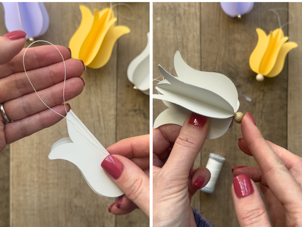 Add a strip of glue down the central spine and loop in some heavy-duty thread so that you can hang your spring decoration. You can then bring the last two sides together to glue and secure them.